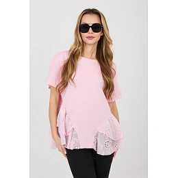 Blůzka každodenní vyrobena z vysoce kvalitní bavlny, která zajišťuje pohodlí po celý den. Model s hladkým, minimalistickým vzorem, díky čemuž je snadno kombinovatelný s mnoha styly, jakými jsou jak každodenní, tak elegantní. Blůzka má klasický, kulatý výstřih a krátký rukáv, což ji činí ideální na teplejší dny. Standardní délka se dobře tvaruje podle postavy a umožňuje ji nosit jak s kalhotami, tak s sukní. Model nemá zapínání, díky čemuž je pohodlný a snadno se obléká. Jako další ozdobný prvek je subtilní, výšivkou zdobený volánek dole, který blůzce dodává lehkost a ženský charakter. Volánek: 85% Viskóza, 15% Nylon