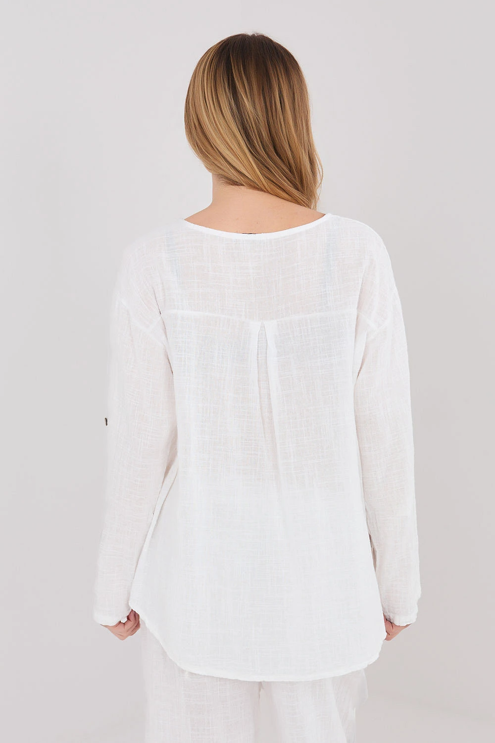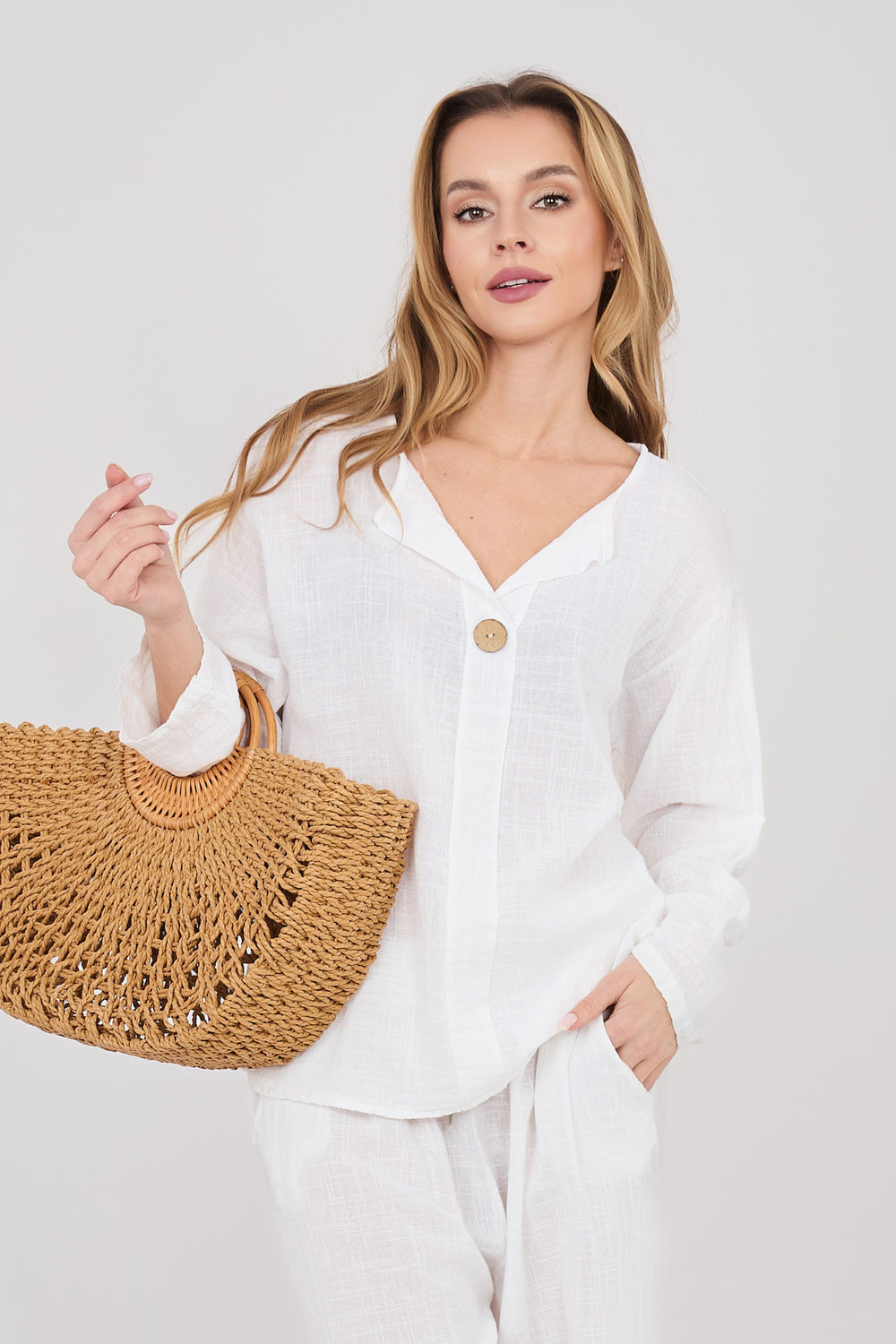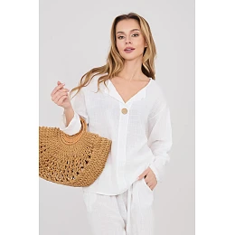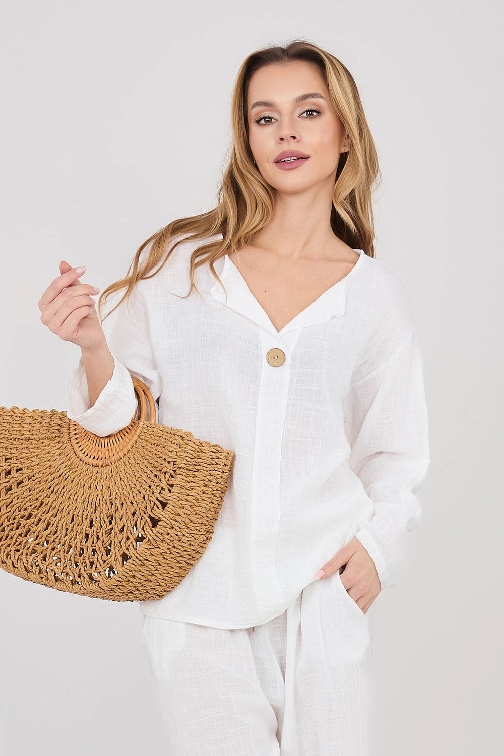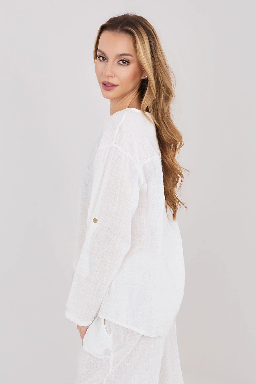 Halena vyrobena z vysoce kvalitní bavlny, která poskytuje pohodlí a prodyšnost po celý den. Model s hladkým vzorem činí halenu univerzální a snadno kombinovatelnou s mnoha styly, jak s džíny, tak i s sukněmi. Halena má výstřih do V zdobený decentním knoflíkem, který jí dodává jemný, ženský charakter. Standardní délka zaručuje dobrou siluetu a umožňuje nosit ji různými způsoby. Model je vybaven dlouhými rukávy s možností přichycení, díky čemuž lze halenu snadno přizpůsobit počasí a stylizaci. Bez zapínání je pohodlná a rychlá na oblékání, ideální na každodenní příležitosti.