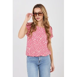 Elegantní každodenní halenka je ideální volbou pro ženy, které ocení pohodlí a stylový vzhled v každodenních outfitcích. Díky univerzálnímu střihu se skvěle hodí jak k džínům, kraťasům, tak i sukní. Model je vyroben z příjemné viskózy, která je lehká, prodyšná a pohodlná na nošení i v teplejších dnech. Halenka má kulatý výstřih a krátké rukávy, co jí dodává volný, ležérní charakter. Na materiálu je potisk, který je hlavním dekorativním prvkem a dodává celku stylový vzhled. Halenka má standardní délku, díky čemuž se dobře tvaruje podle postavy a snadno ji lze sladit s různými kousky šatníku. Model se nasazuje přes hlavu bez zapínání, co zvyšuje pohodlí používání. Jedná se o praktický a stylový návrh na každý den, ideální pro mnoho každodenních outfitů.