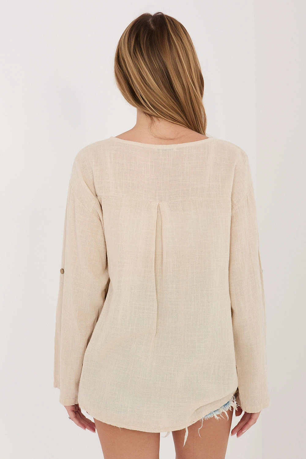 Halenní košile vyrobená z vysokokvalitní bavlny, která poskytuje pohodlí a prodyšnost po celý den. Model s hladkým vzorem činí košili univerzální a snadno kombinovatelnou s mnoha styly, jak do džín, tak do sukně. Košile má výstřih do V ozdobený jemným knoflíkem, který jí dodává jemný, ženský charakter. Standardní délka zajišťuje dobrou přiléhavost k postavě a umožňuje nosit ji různými způsoby. Model je vybaven dlouhými rukávy s možností zkrácení, díky čemuž je košile snadno přizpůsobitelná počasí a stylizaci. Bez zapínání je pohodlná a rychlá na oblékání, ideální na každodenní příležitosti.