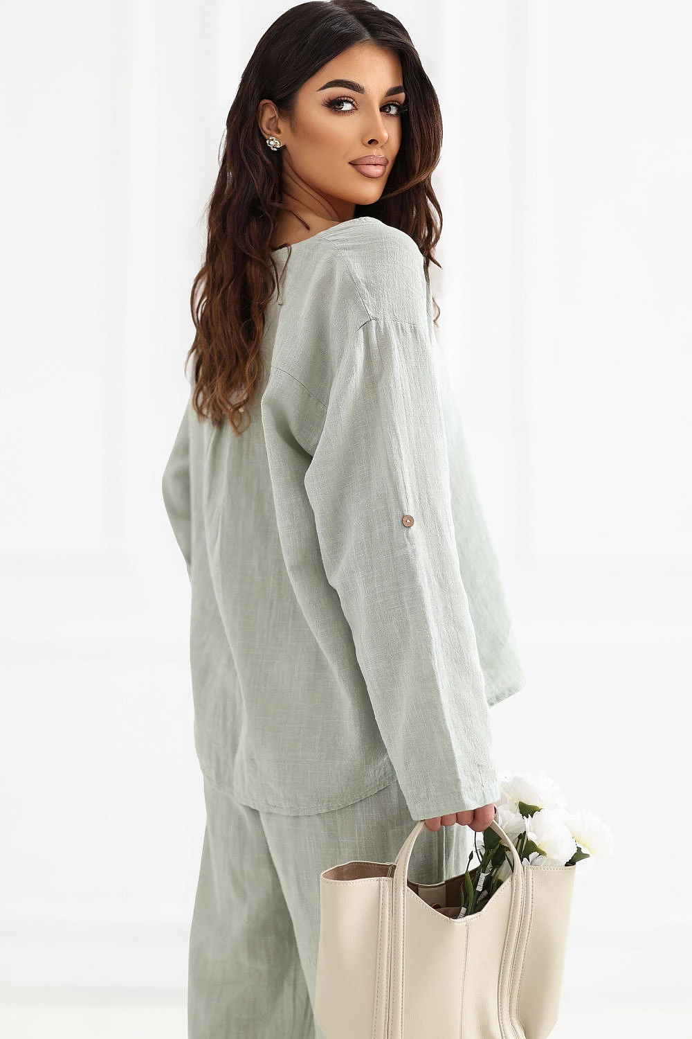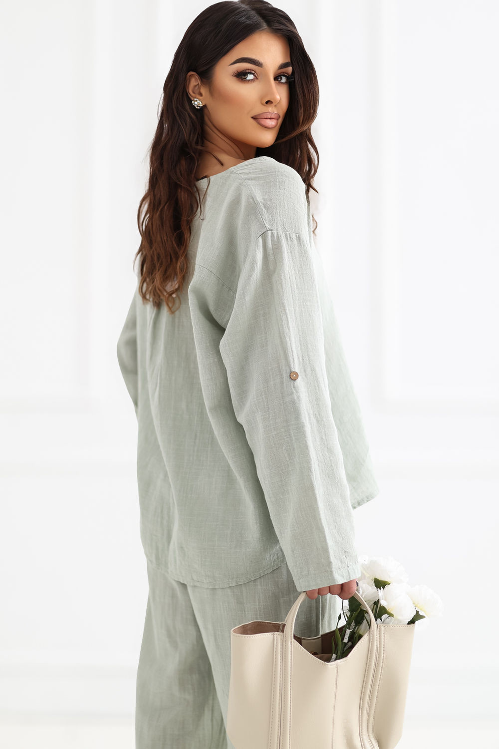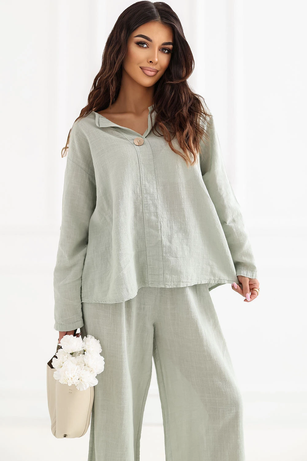 Blůza vyrobena z vysoké kvality bavlny, která poskytuje pohodlí a prodyšnost po celý den. Model s hladkým vzorem dělá z blůzy univerzální kousek, který lze snadno sladit s mnoha styly, jak s džíny, tak s sukněmi. Blůza má výstřih zdobený jemným knoflíkem, který jí dodává jemný ženský charakter. Standardní délka zajišťuje dobře padnoucí střih a umožňuje nosit ji různými způsoby. Model je vybaven dlouhými rukávy s možností přeložení, díky čemuž lze blůzu snadno přizpůsobit počasí a stylizaci. Bez zapínání je pohodlná a rychlá na oblékání, ideální na každodenní příležitosti.