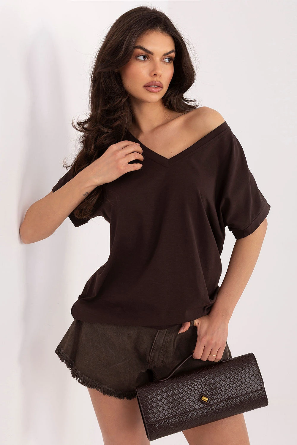 Univerzální košile s každodenním charakterem, která se skvěle hodí jak do práce, tak na běžné nošení. Hladký střih jí dodává nadčasovou eleganci a snadno ji lze kombinovat s různými styly. Vyrobena z vysoké kvality směsi bavlny a elastanu, poskytuje pohodlí nošení a lehké přizpůsobení se postavě. Standardní délka a krátký rukáv z ní dělají skvělý kousek na každou roční dobu. Košile má efektní výstřih ve tvaru písmene V jak vpředu, tak vzadu, což jí dodává jemnou ženskost. Model bez zapínání zdůrazňuje jeho pohodlný a minimalistický charakter.