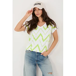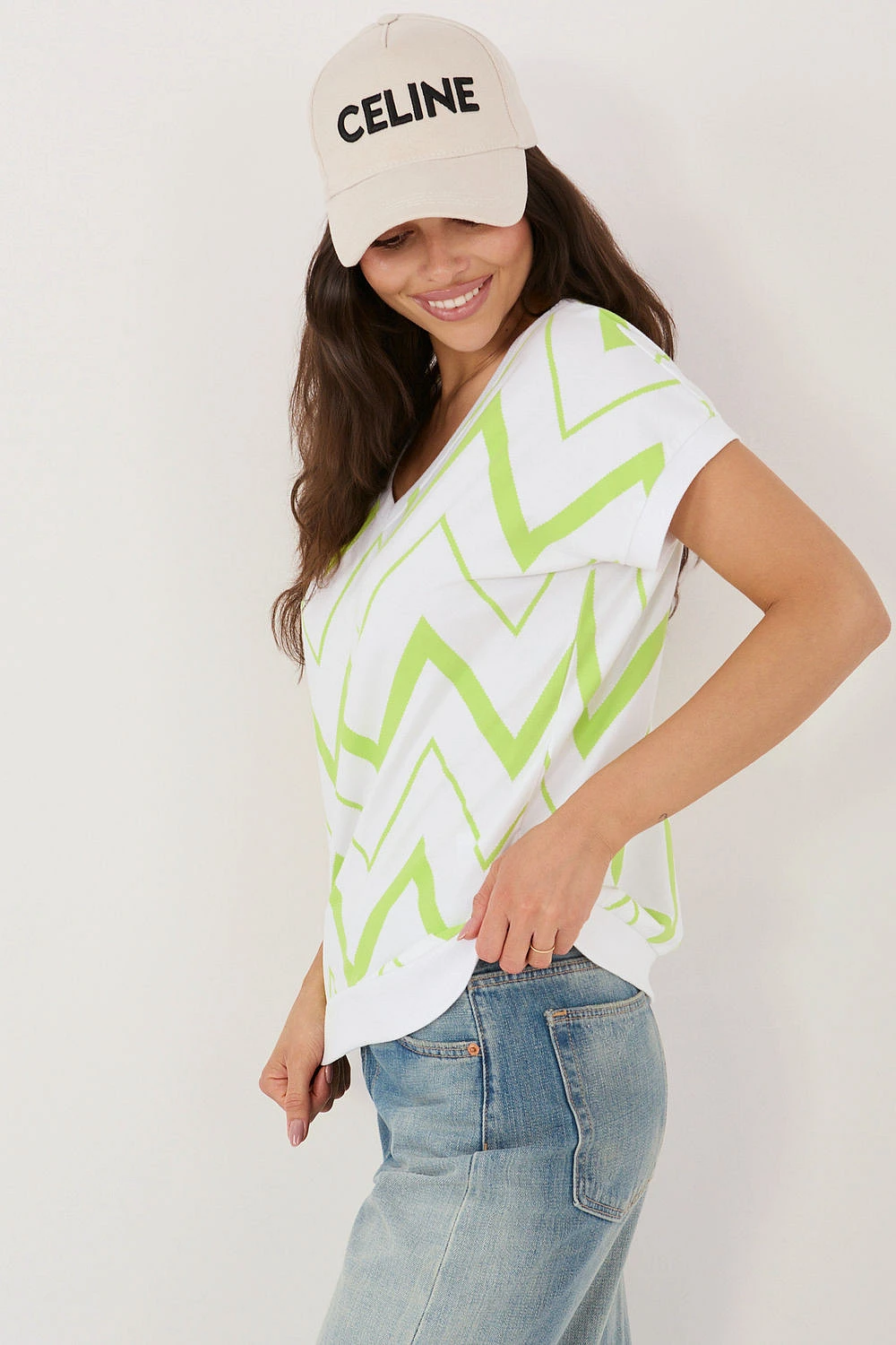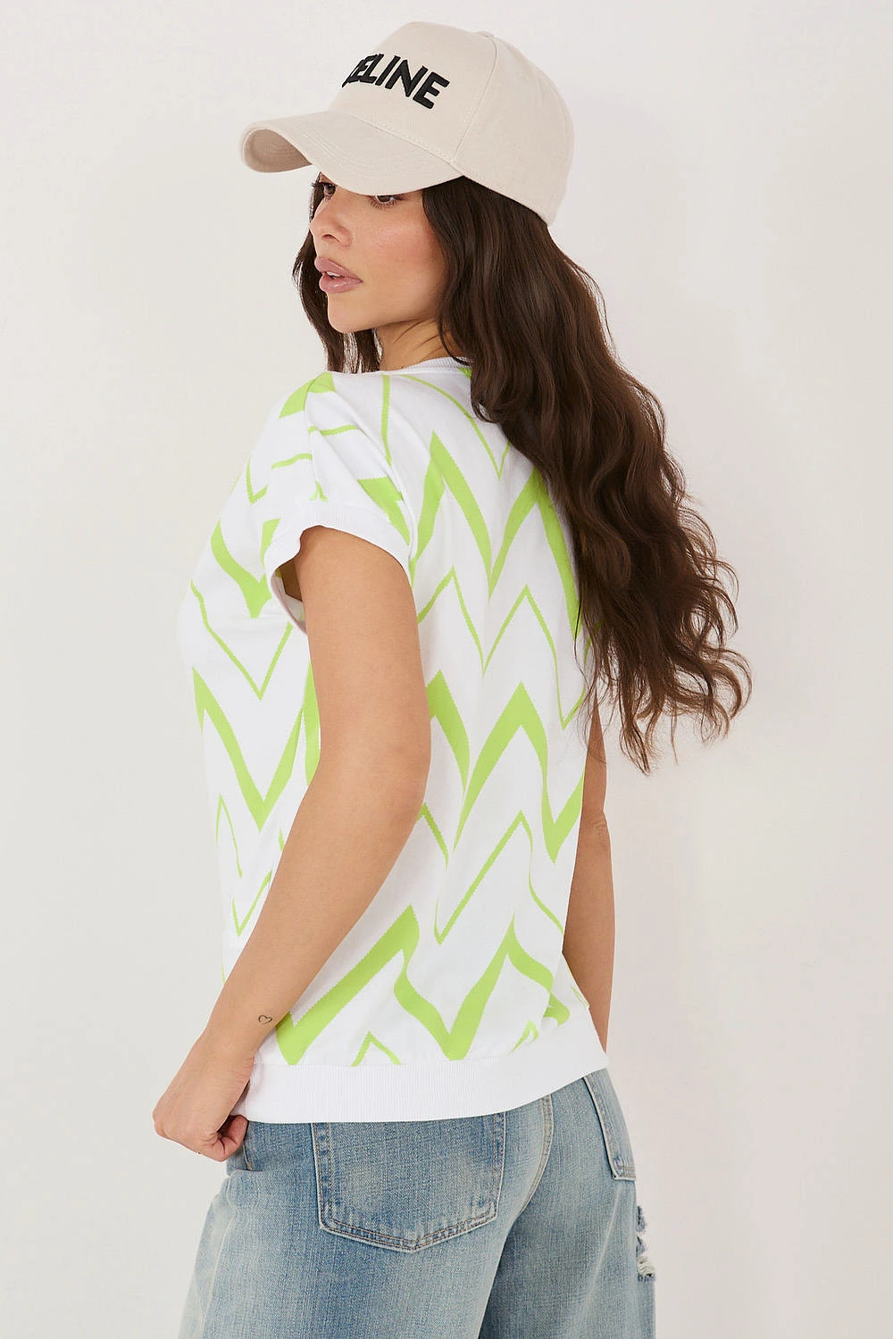 Dámský každodenní top je pohodlnou a stylovou volbou na různé příležitosti. Vyrobený z příjemné směsi bavlny a elastanu, poskytuje pohodlí nošení, dobrou prodyšnost a lehkou pružnost, díky které se přizpůsobuje postavě. Model vyniká geometrickým vzorem, který mu dodává moderní a výrazný charakter. Standardní délka dělá tento top skvěle skloubený jak s kalhotami, tak s sukněmi. Krátký rukáv a výstřih do V decentně zdůrazňují ženskou siluetu, přidávají lehkost celému outfitu. Bez zapínání zvyšuje pohodlí nošení a dělá z tohoto modelu snadno oblékací kousek. Tento univerzální top je ideální na každý den, skvělý jak do práce, tak na méně formální události.