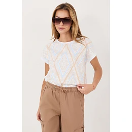 Dámský každodenní top je pohodlný a stylový návrh na různé příležitosti. Vyrobený z příjemné směsi bavlny a elastanu, poskytuje pohodlí, dobrý průdušnost a lehkou pružnost, díky které se přizpůsobuje postavě. Model se vyznačuje geometrickým vzorem, který mu dodává moderní a výrazný charakter. Standardní délka dělá top skvěle kombinovatelný jak s kalhotami, tak s sukněmi. Krátký rukáv a kulatý výstřih jemně zdůrazňují ženskou siluetu, přidávají lehkost celému outfitu. Bez zapínání zvyšuje pohodlí nošení a dělá model snadno oblékatelným. Univerzální top ideální na každý den, skvělý jak do práce, tak na méně formální události.