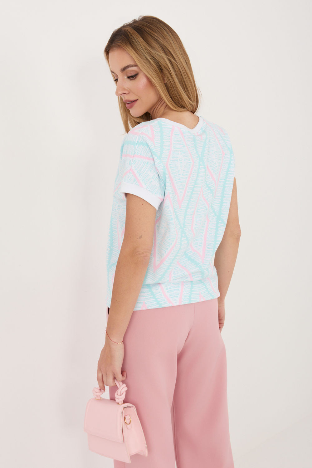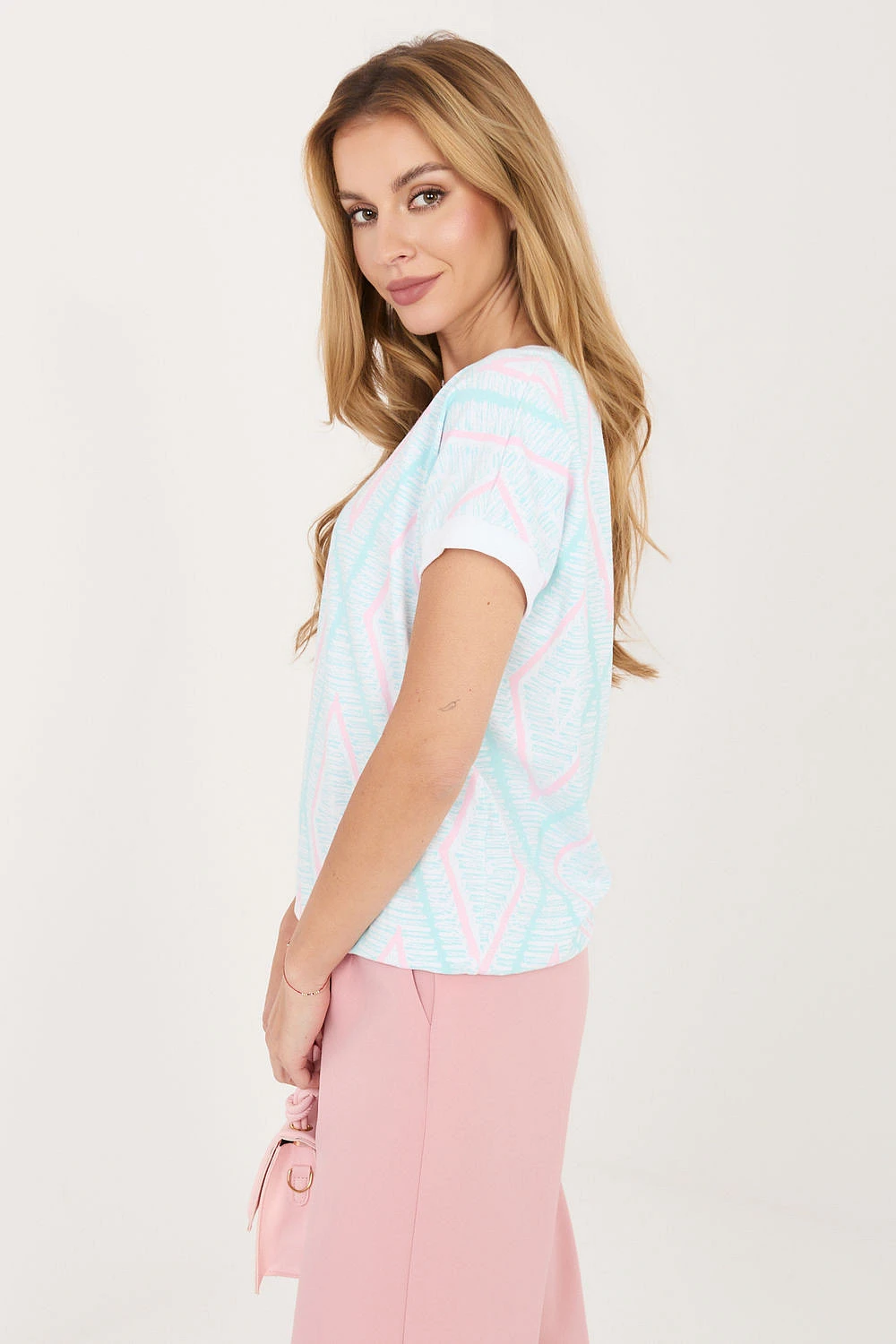 Dámský každodenní top je pohodlný a stylový návrh na různé příležitosti. Vyrobený z příjemné směsi bavlny a elastanu, poskytuje pohodlí nošení, dobré prodyšnost a lehkou pružnost, díky které se přizpůsobuje postavě. Model je zdoben geometrickým vzorem, který mu dodává moderní a výrazný charakter. Standardní délka dělá top skvělým doplňkem jak k kalhotám, tak k sukním. Krátký rukáv a kulatý výstřih jemně zdůrazňují ženskou siluetu, dodávají lehkost celému outfitu. Bez zapínání zvyšuje pohodlí nošení a dělá model snadný na oblékání. Univerzální top ideální na každý den, skvělý jak do práce, tak na méně formální události.