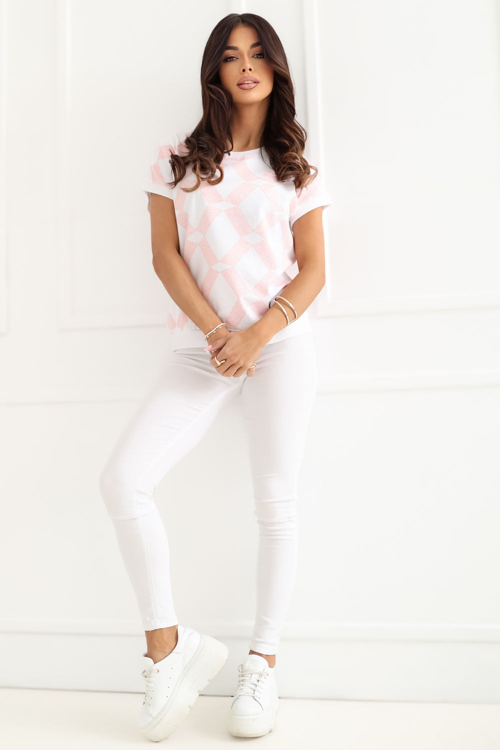 Dámský kaštanový top s každodenním charakterem je pohodlnou a stylovou volbou na různé příležitosti. Vyrobený z příjemné směsi bavlny a elastanu, poskytuje pohodlí nošení, dobrou prodyšnost a lehkou pružnost, díky které se přizpůsobuje postavě. Model je zdoben geometrickým vzorem, který mu dodává moderní a výrazný charakter. Standardní délka dělá top skvěle sladitelným jak s kalhotami, tak s sukněmi. Krátký rukáv a kulatý výstřih jemně zdůrazňují ženskou siluetu, přidávají lehkost celému outfitu. Bez zapínání zvyšuje pohodlí nošení a dělá model snadno oblékacím. Jedná se o univerzální top ideální na každý den, skvělý jak do práce, tak na méně formální události.
