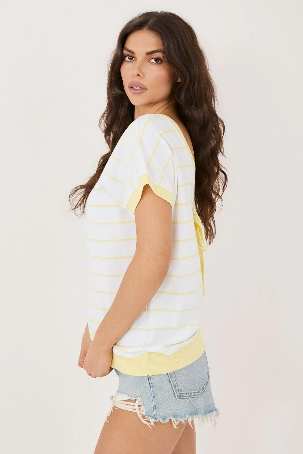 Blůza s každodenním charakterem je stylovým a pohodlným návrhem jak pro každý den, tak i do práce. Vyrobená z vysoce kvalitní směsi bavlny a elastanu, poskytuje pohodlí nošení, prodyšnost a lehkou pružnost, díky čemuž se dobře přizpůsobuje postavě. Model zdobí nadčasový pruhovaný vzor, který dodává celku klasický, a zároveň moderní vzhled. Standardní délka dělá z blůzy skvělý doplněk k různým kouskům oblečení, od kalhot po sukně. Krátký rukáv a kulatý výstřih vpředu zdůrazňují její univerzální charakter. Zadní strana přitahuje pozornost díky efektnímu výstřihu ve tvaru písmene V a ozdobné mašli, které dodávají celku ženský šarm a originalitu. Bez zapínání je blůza pohodlná a snadná na nasazení. To je skvělá volba pro ženy, které oceňují kombinaci klasiky s jemnými, dekorativními detaily.