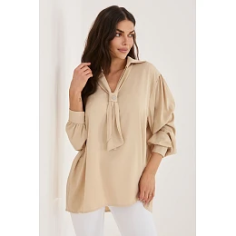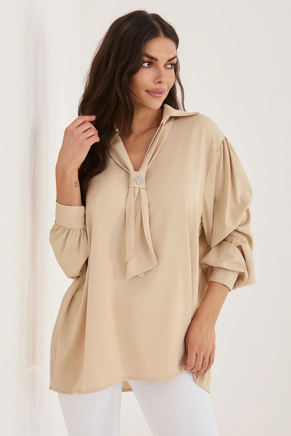 Elegantní stylová halenka je ideální volbou pro každodenní nošení, do práce a na společenské události, kdy chcete vypadat elegantně a s třídou. Její hladký vzor zdůrazňuje minimalistický, ale zároveň velmi ženský charakter, díky čemuž se skvěle hodí do mnoha stylizací, jak formálních, tak volnějších. Model je vyroben z lehkého, příjemného na dotek polyesteru, který se krásně skládá na postavě. Prodloužený střih a dlouhý rukáv zajistí, že halenka vypadá elegantně a zaručuje pohodlí při nošení po celý den. Výjimečným prvkem je výstřih do V s mašlí, který umožňuje jemné upravení stylu od klasického po romantický. Celkový dojem dotváří odnímatelná brož, která dodává elegantní bižuterní akcent. Nadýchané rukávy přinášejí módní, jemně výraznou linii, a absence zapínání zajišťuje pohodlí a jednoduchost oblékání. Je to halenka, která s lehkostí zdůrazní váš elegantní styl, bez ohledu na příležitost.