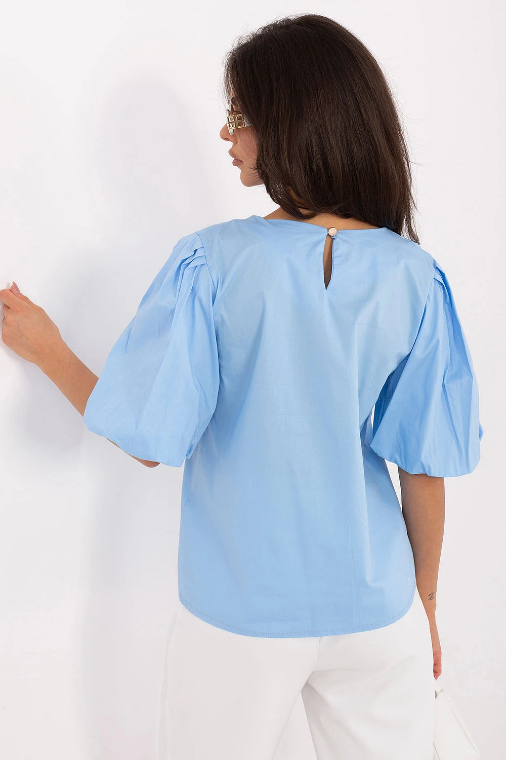 Blůza elegantního a univerzálního charakteru je stylovým návrhem ideálním na každý den, do práce a na formální příležitosti. Její hladký vzor zdůrazňuje minimalistický a nadčasový design, který lze snadno sladit s různými kousky oblečení. Model standardní délky s krátkým nadýchaným rukávem dodává postavě lehkost a jemně zdůrazňuje ženský charakter stylizace. Kulatý výstřih dodává celku klasickou eleganci a zapínání na jedno tlačítko na krku představuje jemný, estetický detail. Vyrobena z vysoce kvalitní směsi bavlny a elastanu, blůza je příjemná na dotek, prodyšná a jemně elastická, což zajišťuje pohodlí během celého dne a dobře se přizpůsobuje postavě. Jedná se o elegantní a zároveň pohodlný kousek oblečení, který se hodí jak do kancelářských, tak do formálních stylizací.