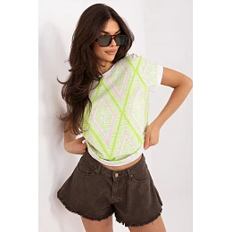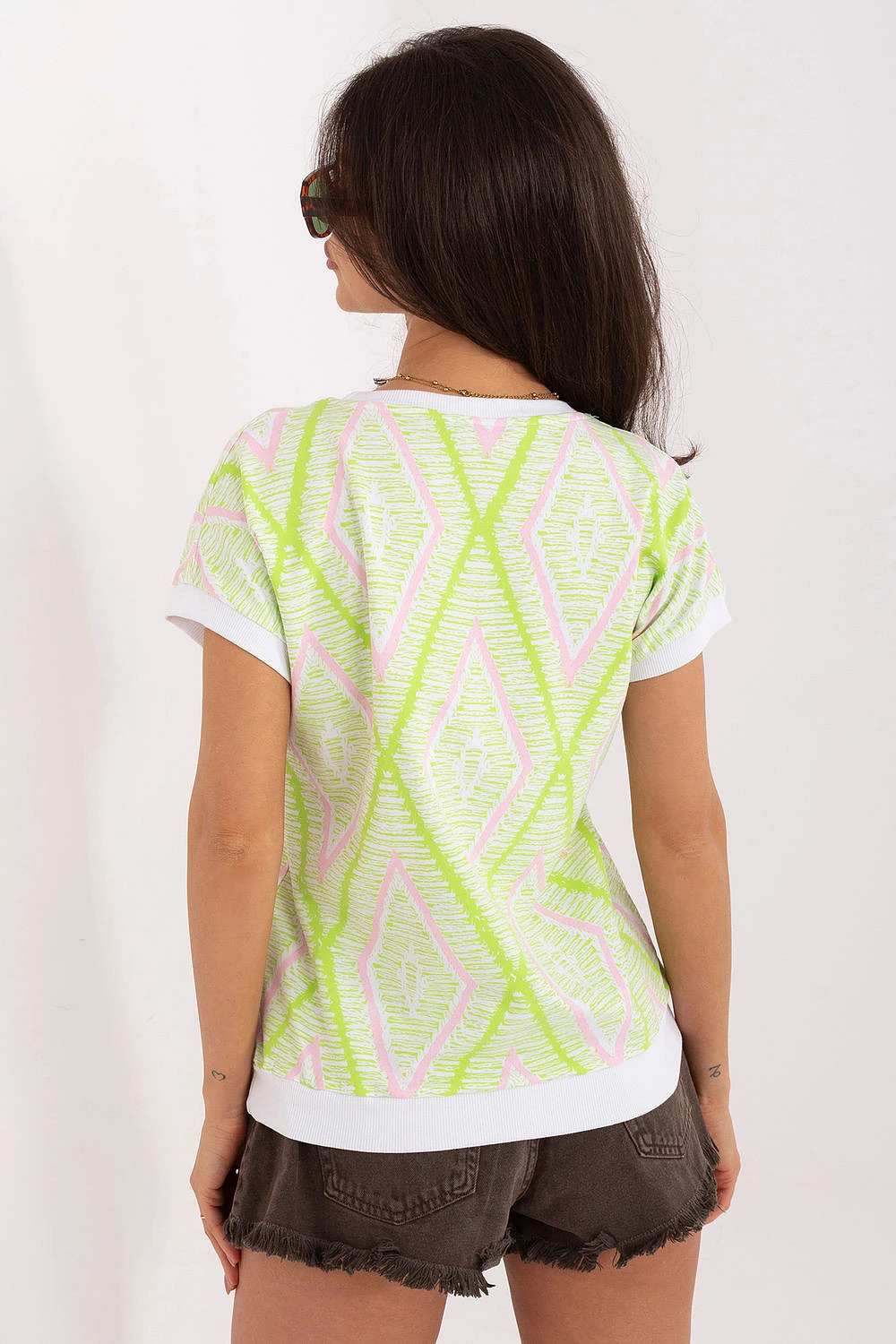 Dámský každodenní top je pohodlný a stylový návrh na různé příležitosti. Vyrobený z příjemné směsi bavlny a elastanu, poskytuje pohodlí, dobrou prodyšnost a lehkou pružnost, díky které se přizpůsobuje postavě. Model je vyznačen geometrickým vzorem, který mu dodává moderní a výrazný charakter. Standardní délka z něj dělá skvělý doplněk jak k kalhotám, tak ke sukni. Krátký rukáv a kulatý výstřih decentně zdůrazňují ženskou siluetu, přidávají lehkost celému outfitu. Bez zapínání zvyšuje pohodlí nošení a zjednodušuje oblékání. Univerzální top ideální na každý den, skvělý jak do práce, tak na méně formální události.
