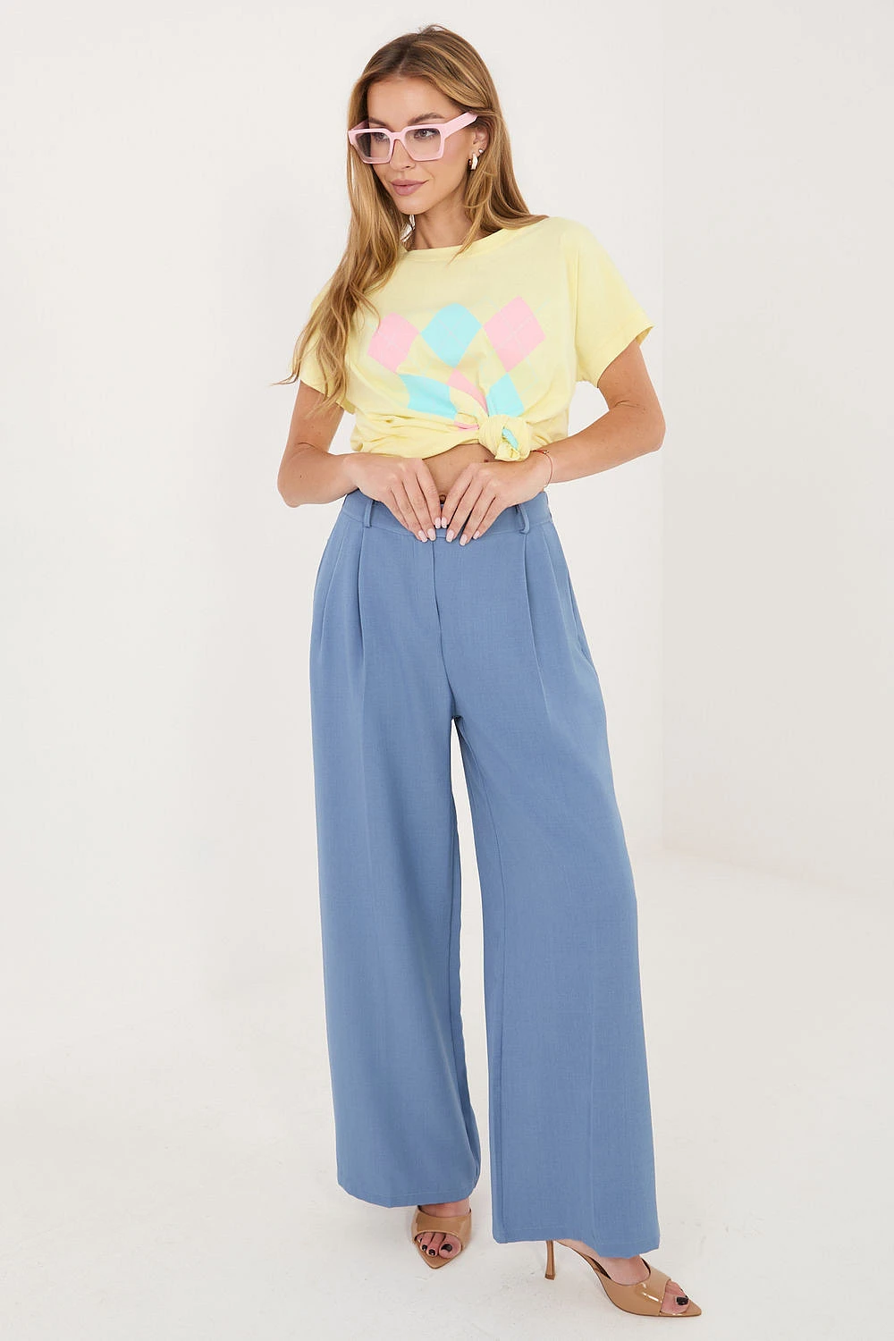 Dámský top s každodenním charakterem je pohodlný a stylový návrh na různé příležitosti. Vyrobena z příjemné směsi bavlny a elastanu, poskytuje pohodlí nošení, dobrou prodyšnost a lehkou pružnost, díky které se přizpůsobuje postavě. Model je zdoben geometrickým vzorem, který mu dodává moderní a výrazný charakter. Standardní délka dělá top skvěle sladěný jak s kalhotami, tak s sukněmi. Krátký rukáv a kulatý výstřih decentně zdůrazňují ženskou siluetu, přidávají lehkost celému outfitu. Bez zapínání zvyšuje pohodlí nošení a dělá model snadným na nasazení. Jedná se o univerzální top ideální na každý den, skvělý jak do práce, tak na méně formální události.
