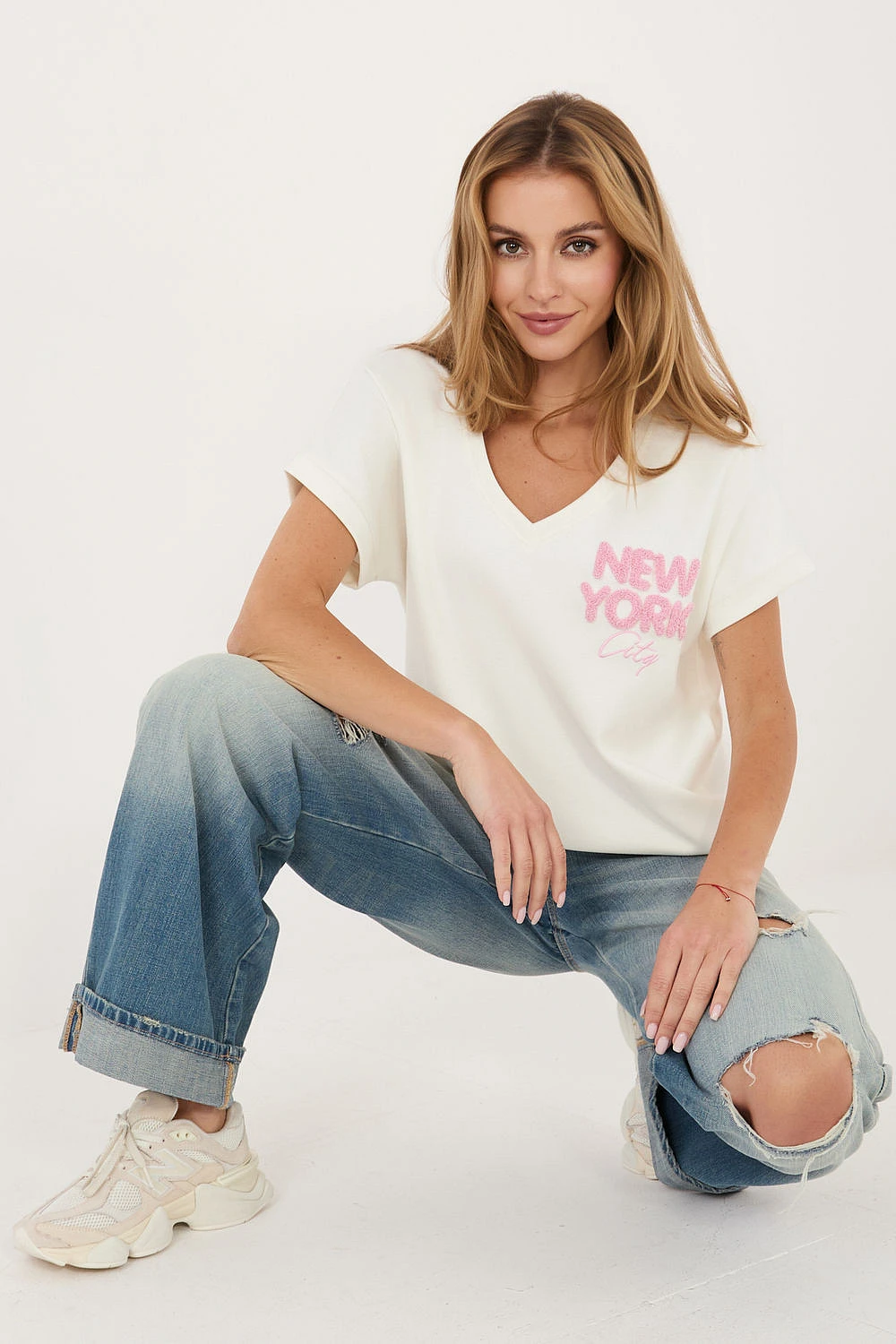 Každodenní blůza standardní délky je pohodlnou a stylovou volbou na každý den. Vyrobená z měkké směsi viskózy a elastanu poskytuje pohodlí při nošení, prodyšnost a jemnou pružnost, díky čemuž se dobře přizpůsobuje postavě. Model má krátký rukáv a výstřih do V, který jemně zdůrazňuje krk a dodává celku ženský charakter. Vpředu, na levé straně v oblasti hrudníku, je ozdobný nápis, který představuje módní akcent a dodává blůze moderní vzhled. Bez zapínání je blůza velmi pohodlná a praktická v každodenním používání. Jedná se o univerzální kus oblečení, který skvěle zapadne do každodenních outfitů.