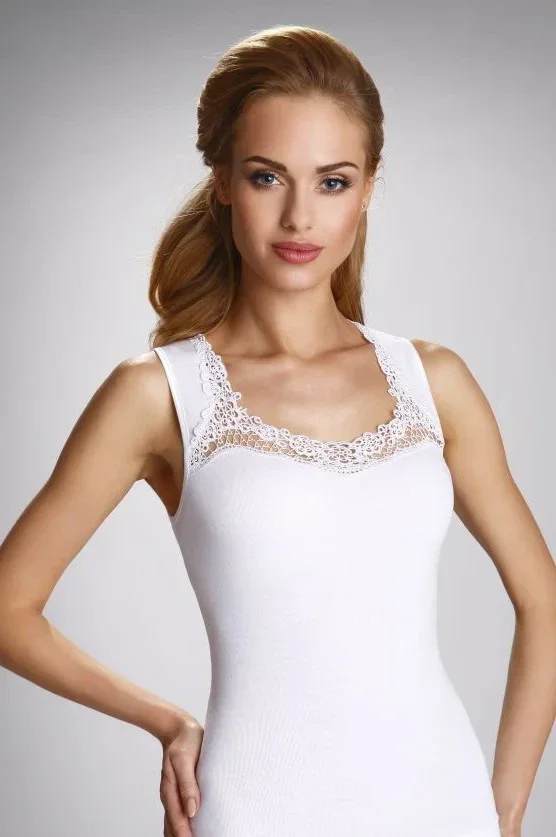 Stylová halenka s krásným gipiérovým lemem ve výstřihu. Měkké a pružné, vyrobené z bavlny. Širší ramenní popruhy mu dodávají zajímavý charakter.