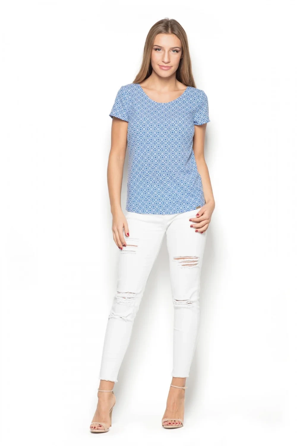 Halenka z látky s jemným geometrickým vzorem a krátkými rukávy. Skvěle se hodí pro mnoho příležitostí.