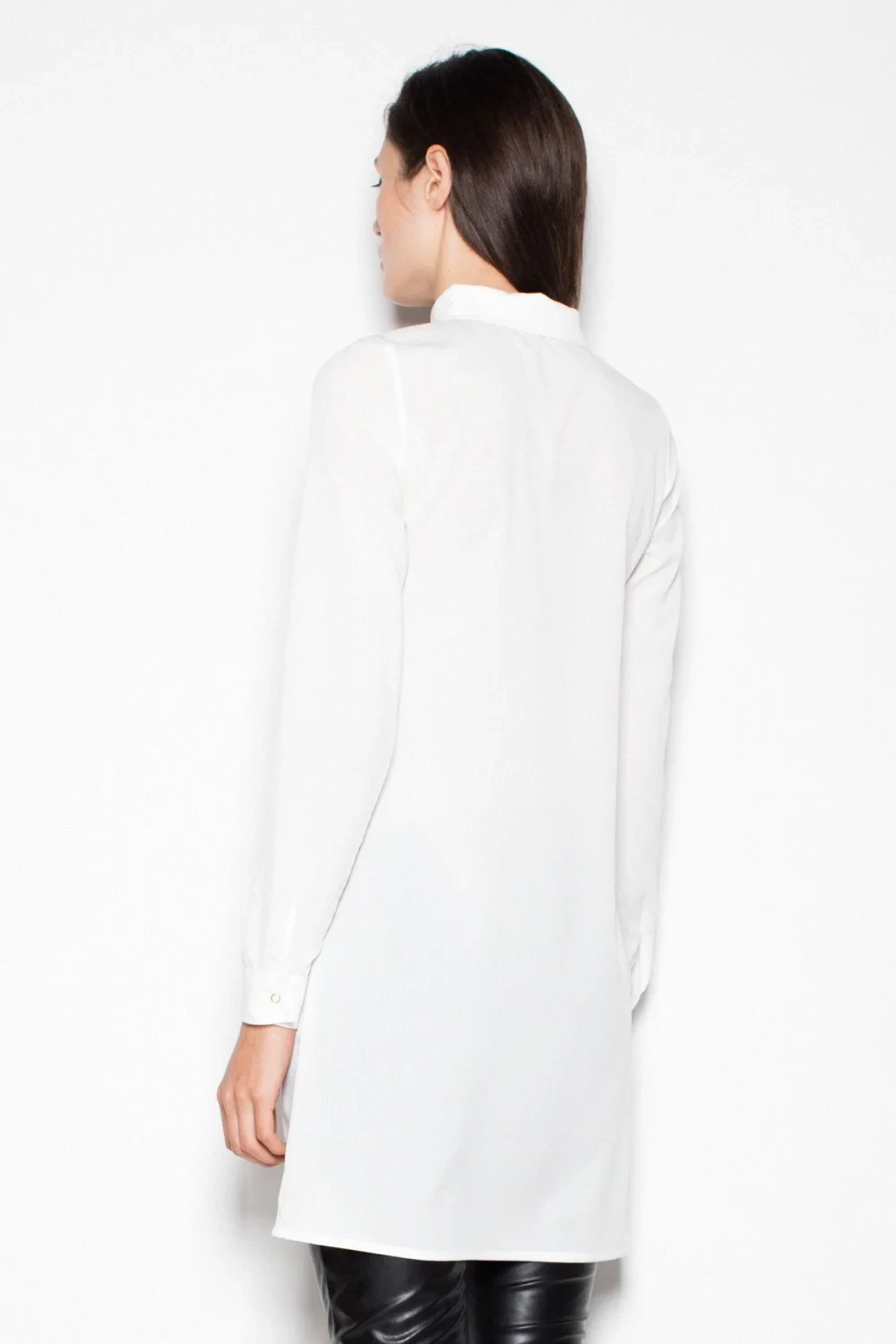 Košilová halenka z lehkého a příjemného úpletu, s dlouhými rukávy a jemným límečkem. Zapíná se na knoflíky u krku. Ideální pro těsné kalhoty.