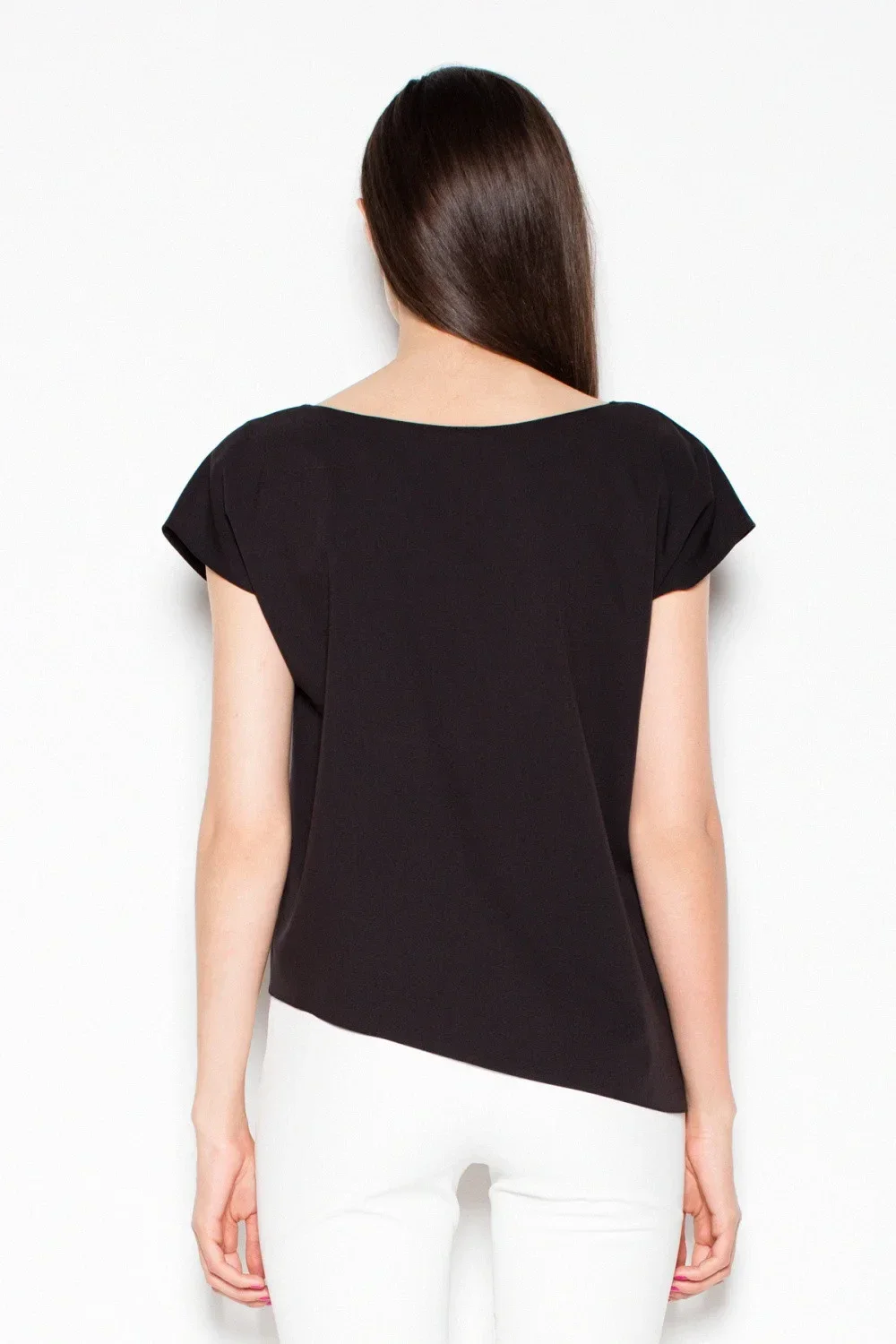 Volná halenka s kulatým výstřihem a rukávy odhalujícími ramena. Model s asymetrickým střihem. Stylové a elegantní, ideální pro každou postavu.