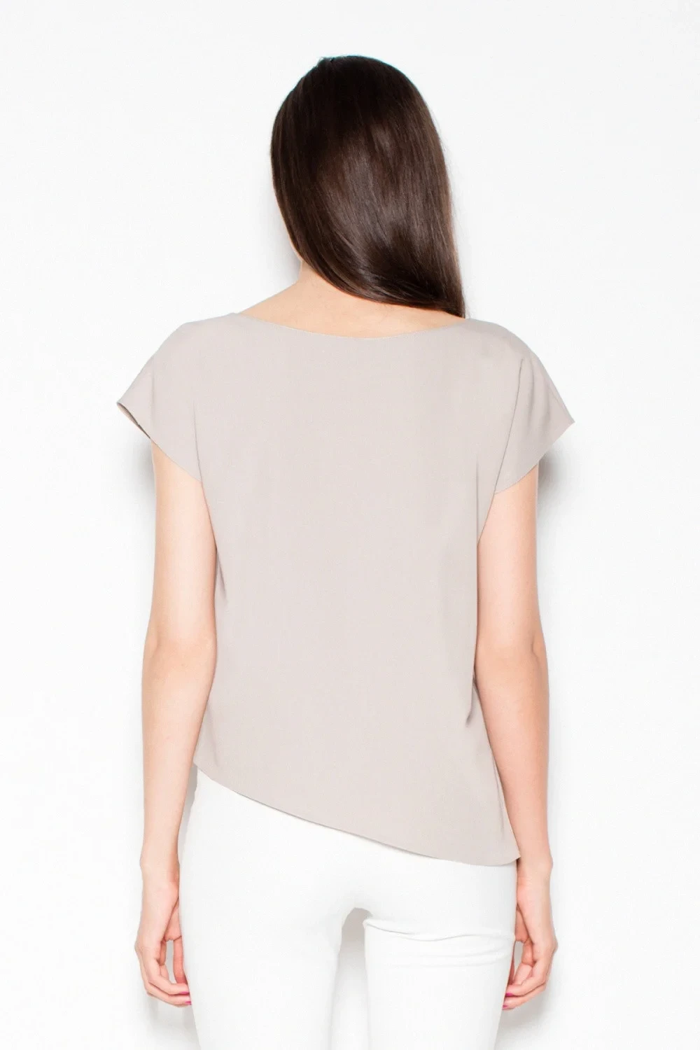 Volná halenka s kulatým výstřihem a rukávy odhalujícími ramena. Model s asymetrickým střihem. Stylové a elegantní, ideální pro každou postavu.
