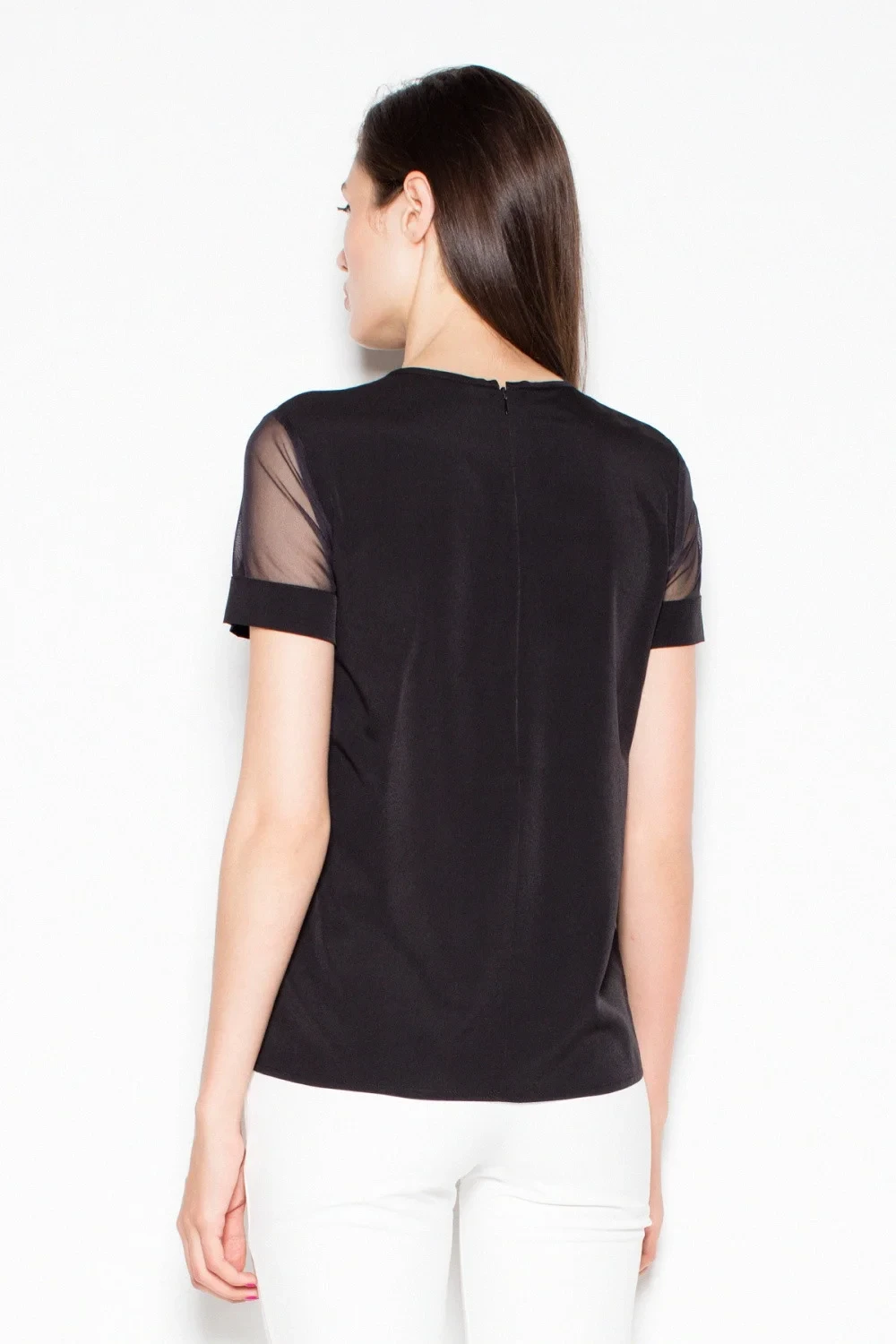 Elegantní halenka s krátkými rukávy a půlkulatým výstřihem. Ozdobné průhledné prvky ve výstřihu a na rukávech. Model vyrobený z kvalitního materiálu.
