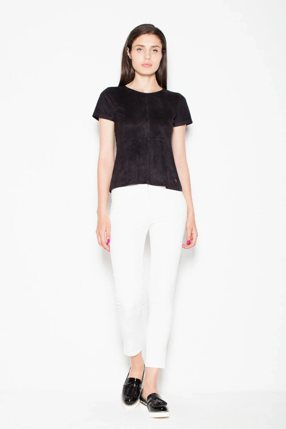 Vzdušná semišová halenka s krátkými rukávy a půlkruhovým výstřihem. Ozdobný zlatý zip na zadní straně. Klasický střih, skvělý pro každodenní nošení.