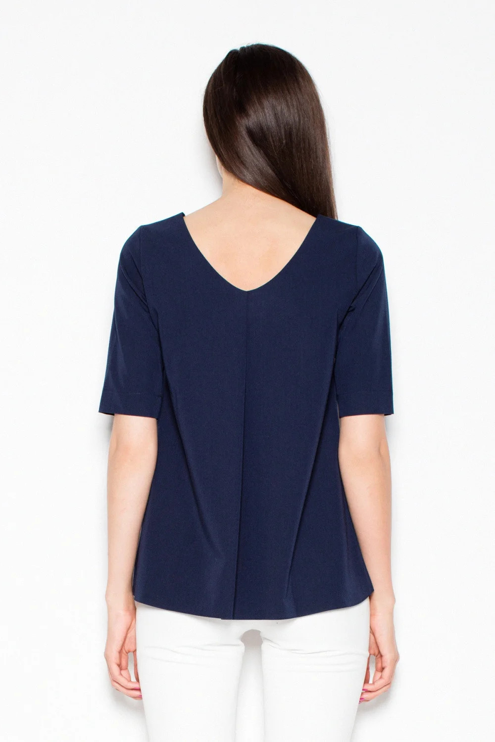 Elegantní halenka s krátkými rukávy a asymetrickým střihem. Na zádech má výřez, který krásně zvýrazňuje záda. Halenka se hodí k odpovídajícím kalhotám.