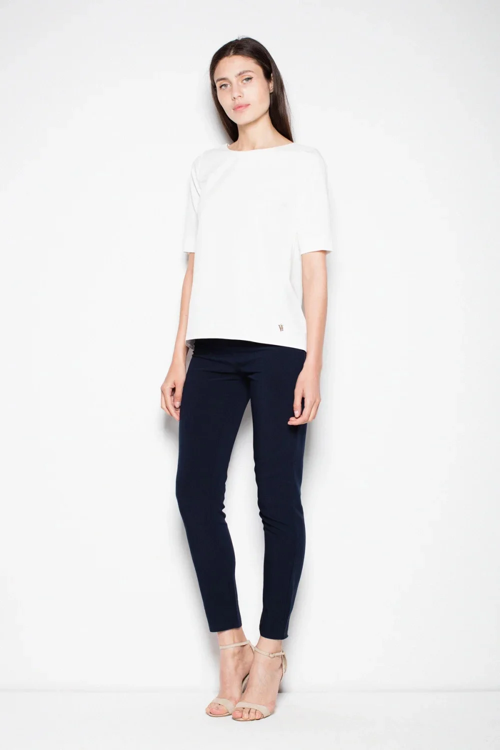 Elegantní halenka s krátkými rukávy a asymetrickým střihem. Na zádech má výřez, který krásně zvýrazňuje záda. Halenka se hodí k odpovídajícím kalhotám.