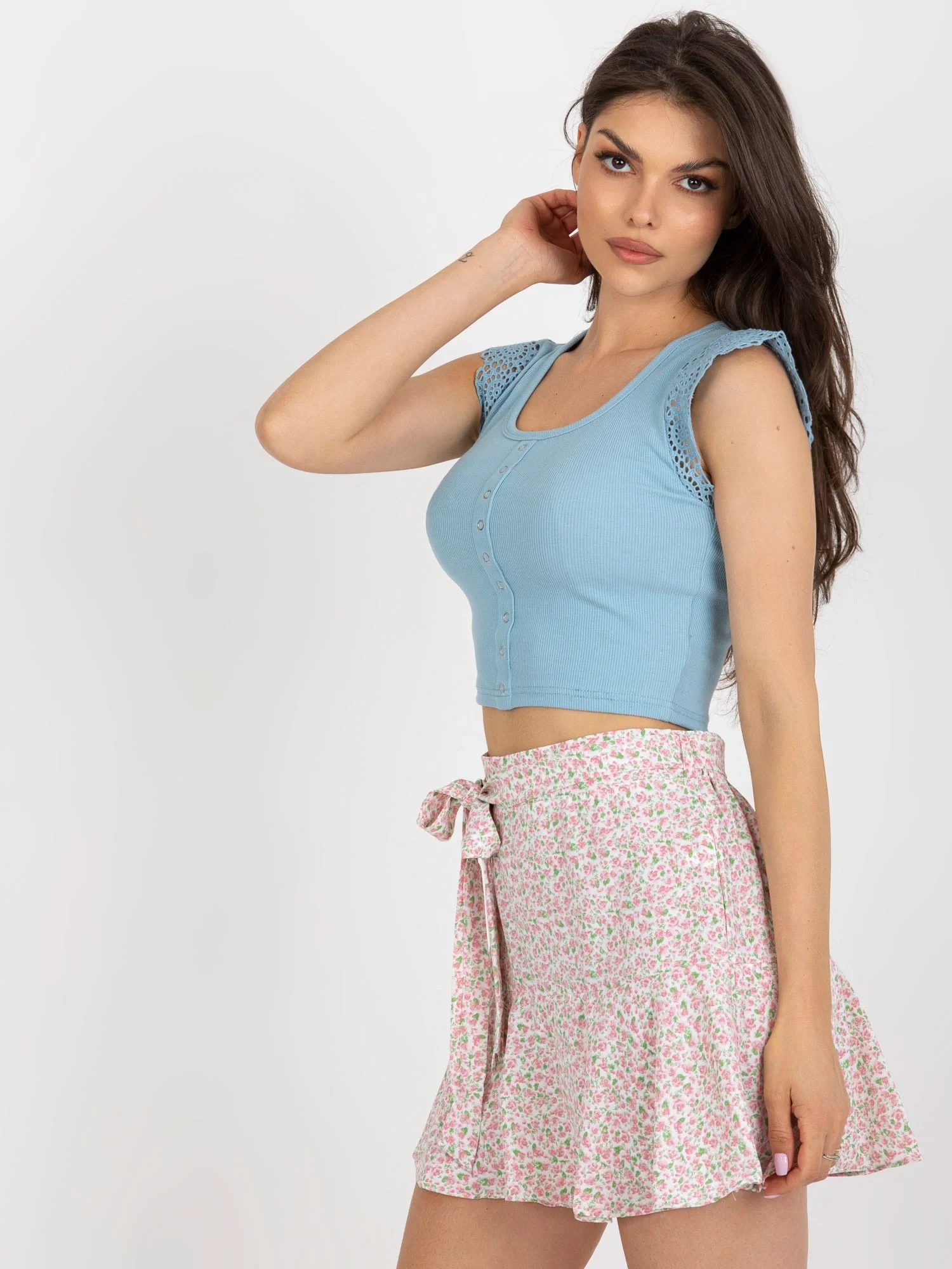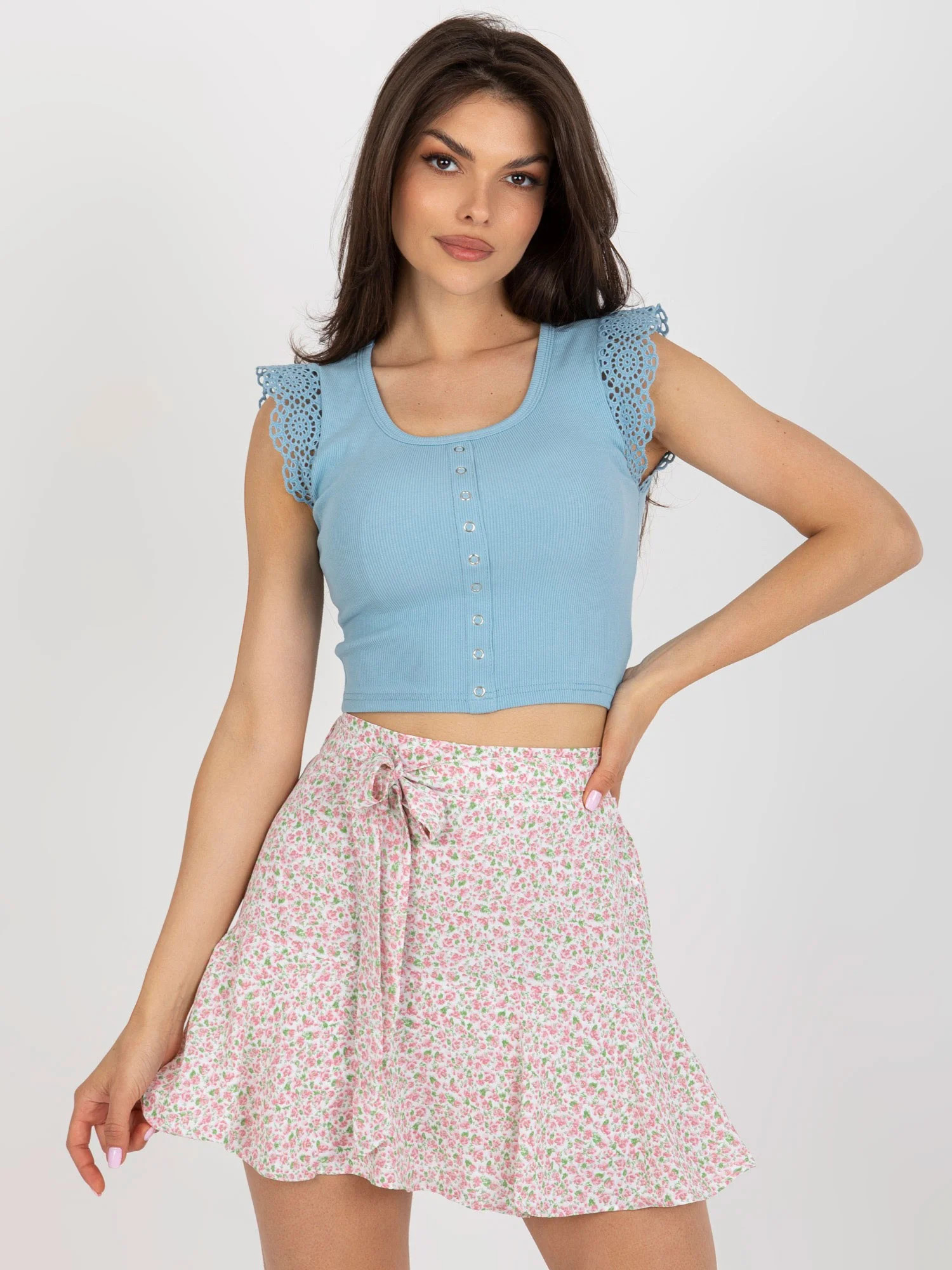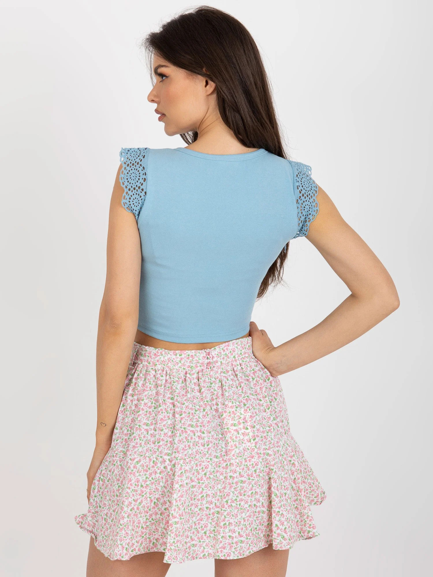 Světle modrá bavlněná halenka s žebrovanou krajkou .