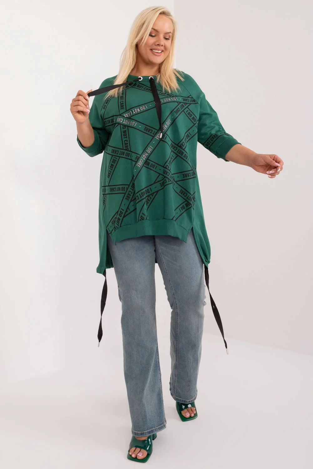 Asymetrická halenka plus size je každodenní kousek s jednoduchým, elegantním střihem, ideální pro každodenní nošení. Je vyrobena z bavlny s přídavkem elastanu, což zaručuje pohodlí a lehký střih. Prodloužený střih a 3/4 rukávy zajišťují volnost pohybu a pohodlí. Halenka má kulatý výstřih, který jí dodává klasický vzhled. Na přední straně je nápis zdobený kamínky, který dodává halence módní a originální charakter. Ideální pro každodenní stylizaci, ať už do práce, nebo na běžné vycházky.