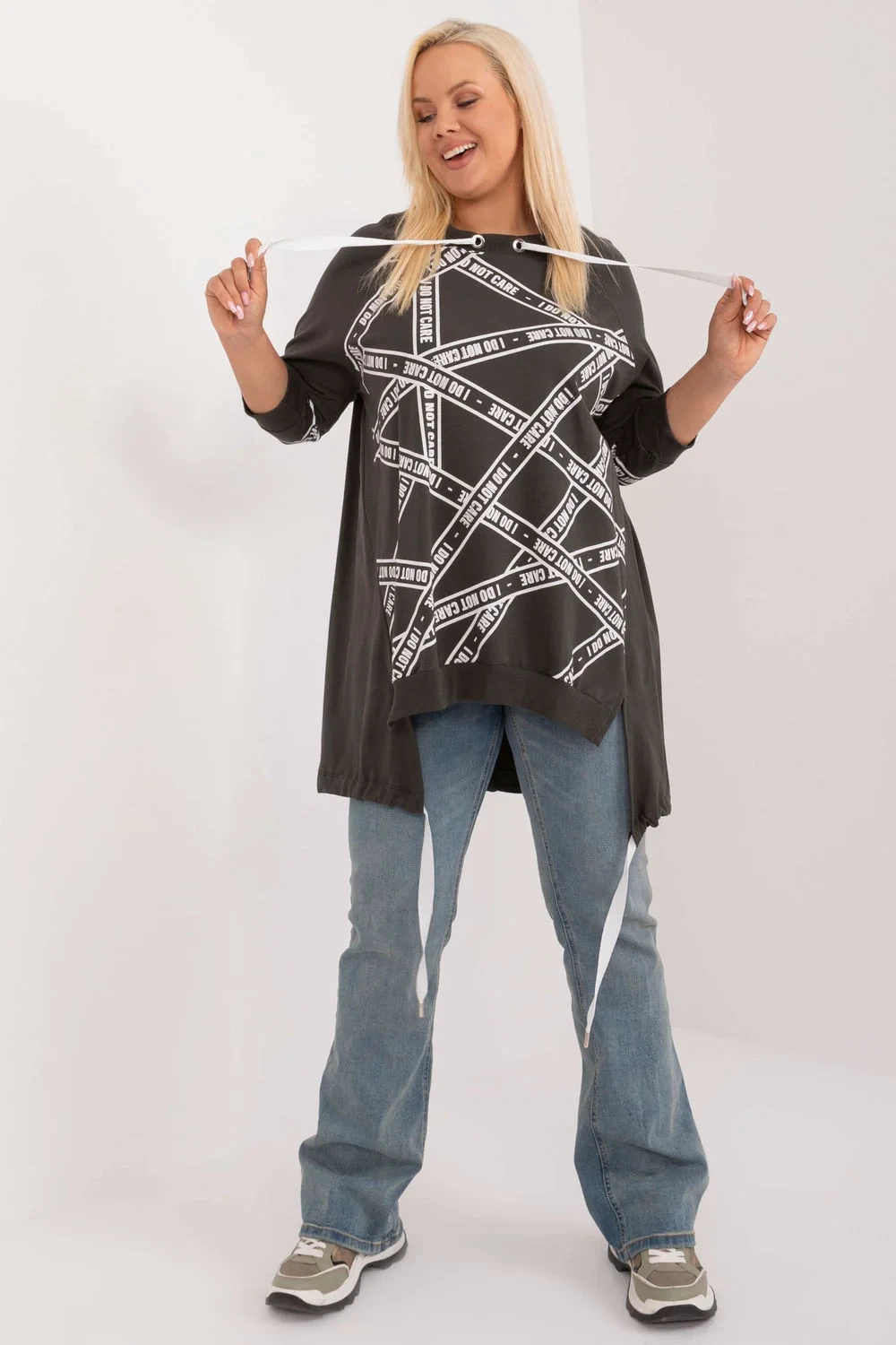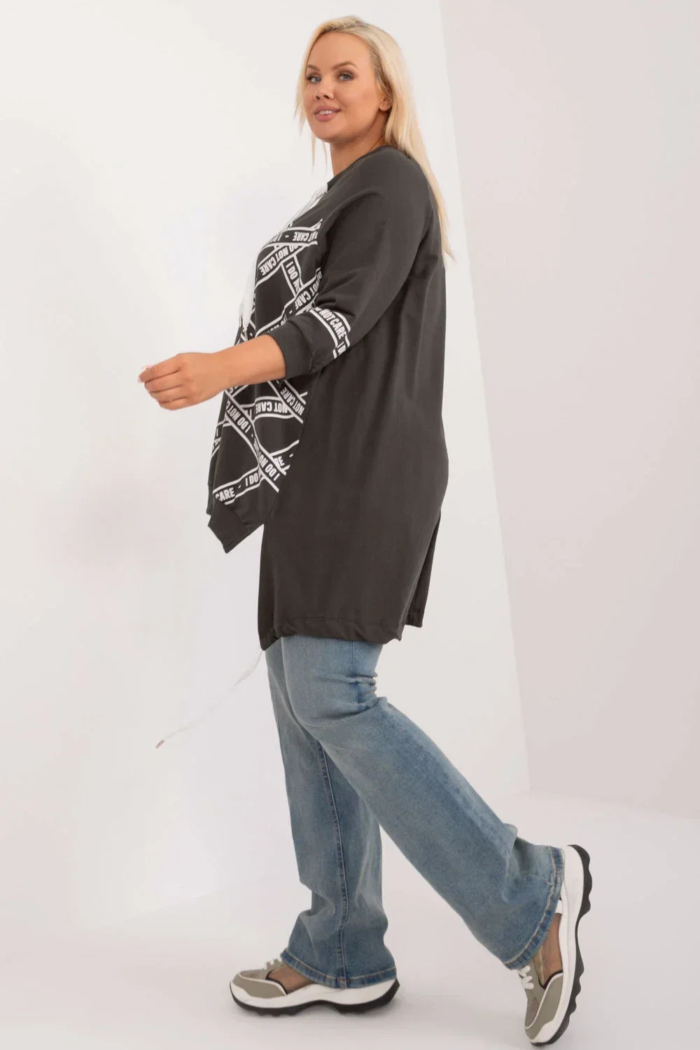 Asymetrická halenka plus size je každodenní kousek s jednoduchým, elegantním střihem, ideální pro každodenní nošení. Je vyrobena z bavlny s přídavkem elastanu, což zaručuje pohodlí a lehký střih. Prodloužený střih a 3/4 rukávy zajišťují volnost pohybu a pohodlí. Halenka má kulatý výstřih, který jí dodává klasický vzhled. Na přední straně je nápis zdobený kamínky, který dodává halence módní a originální charakter. Ideální pro každodenní stylizaci, ať už do práce, nebo na běžné vycházky.