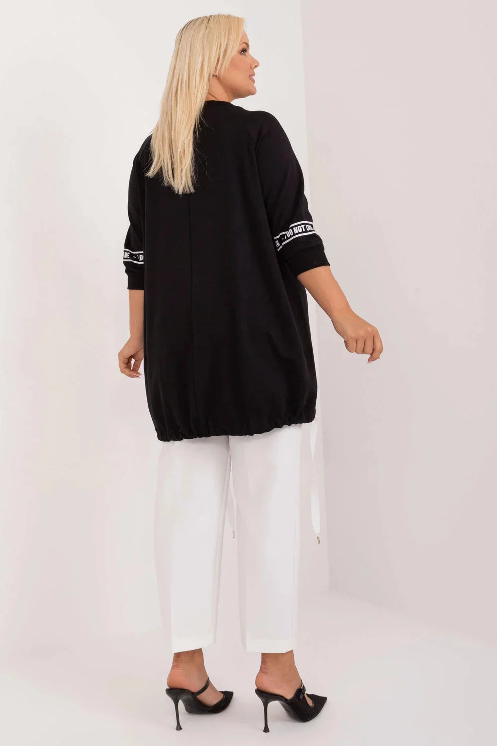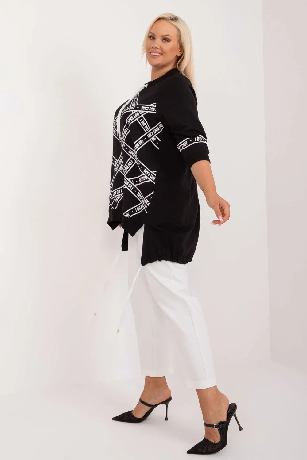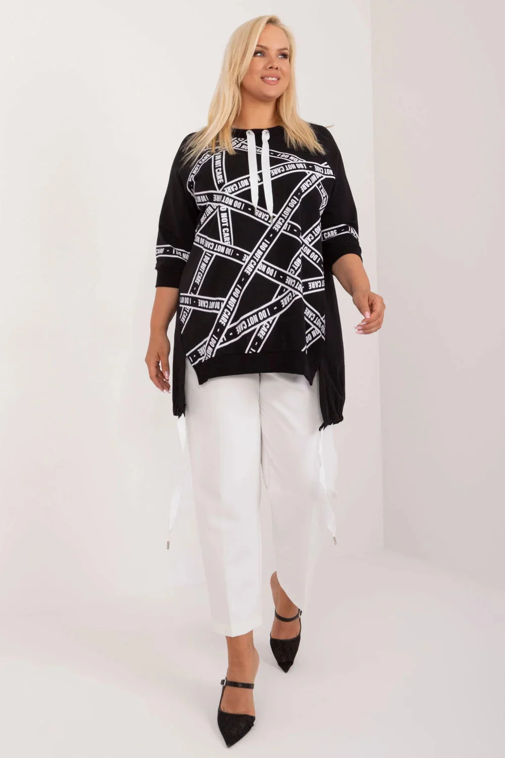 Asymetrická halenka plus size je každodenní kousek s jednoduchým, elegantním střihem, ideální pro každodenní nošení. Je vyrobena z bavlny s přídavkem elastanu, což zaručuje pohodlí a lehký střih. Prodloužený střih a 3/4 rukávy zajišťují volnost pohybu a pohodlí. Halenka má kulatý výstřih, který jí dodává klasický vzhled. Na přední straně je nápis zdobený kamínky, který dodává halence módní a originální charakter. Ideální pro každodenní stylizaci, ať už do práce, nebo na běžné vycházky.