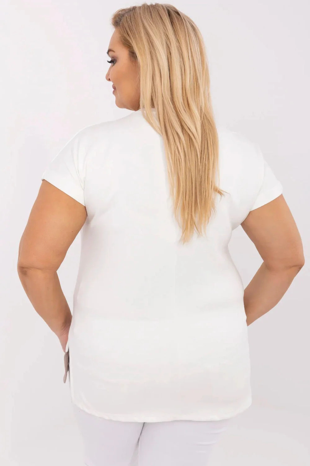 Tento každodenní plus size tričko je skvělou kombinací pohodlí a ležérního stylu. Vyrobeno z mimořádně měkkého a příjemného materiálu, který se příjemně dotýká těla (viskóza s příměsí elastanu a polyesteru), skvěle se přizpůsobuje tělu a poskytuje pohodlí po celý den. Hladká struktura a klasický, kulatý výstřih dělají tento model vhodným pro mnoho stylizací, standardní délka a krátký rukáv ho činí praktickou volbou na každý den. Kontrastní vložka dole vpředu přidává tričku moderní akcent a opticky zeštíhluje postavu. Bez zapínání, snadné oblékání a nošení.