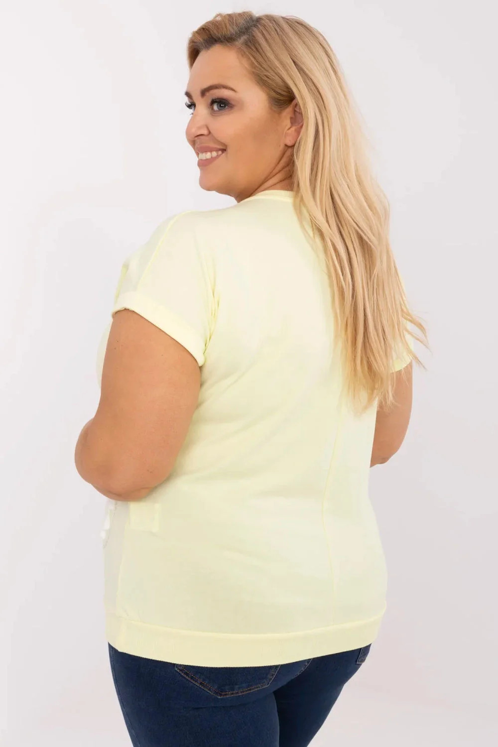 Tato casualová blůza plus size je ideální nabídkou na každý den pro ženy, které ocení pohodlí a jemné ozdobné akcenty. Vyrobená z měkké, elastické látky z kombinace bavlny a elastanu poskytuje pohodlí a volnost pohybu. Klasický, kulatý výstřih a standardní délka dělají z blůzy skvělý doplněk jak ke kalhotám, tak k sukni. Krátký rukáv jí dodává lehkost, a aplikace z flitrů přidává lesk a zdůrazňuje individuální styl. Model nemá zapínání, stačí si ji obléknout a užívat si pohodlí po celý den.