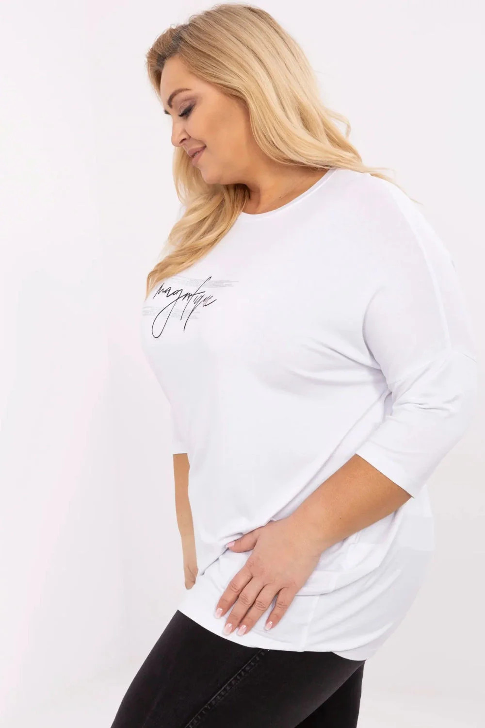Tato každodenní košile ve stylu casual je skvělou kombinací pohodlí a stylu. Vyrobená z měkké, elastické látky z viskózy a elastanu, poskytuje volnost pohybu a příjemné přiléhání k postavě. Model s standardní délkou a rukávy 3/4 s klasickým kulatým výstřihem se hodí do mnoha každodenních stylizací. Přední část košile zdobí moderní nápisy doplněné aplikací z lesklých flitrů, které celku dodávají výrazný charakter. Bez zapínání je košile snadná na nasazení a velmi pohodlná k nošení.