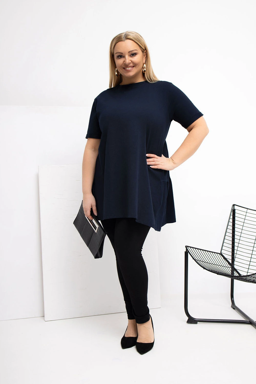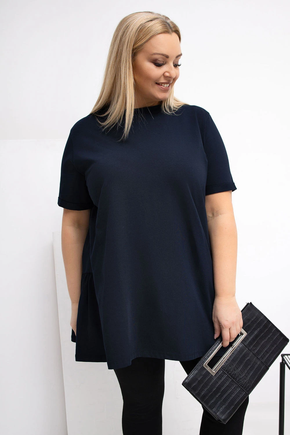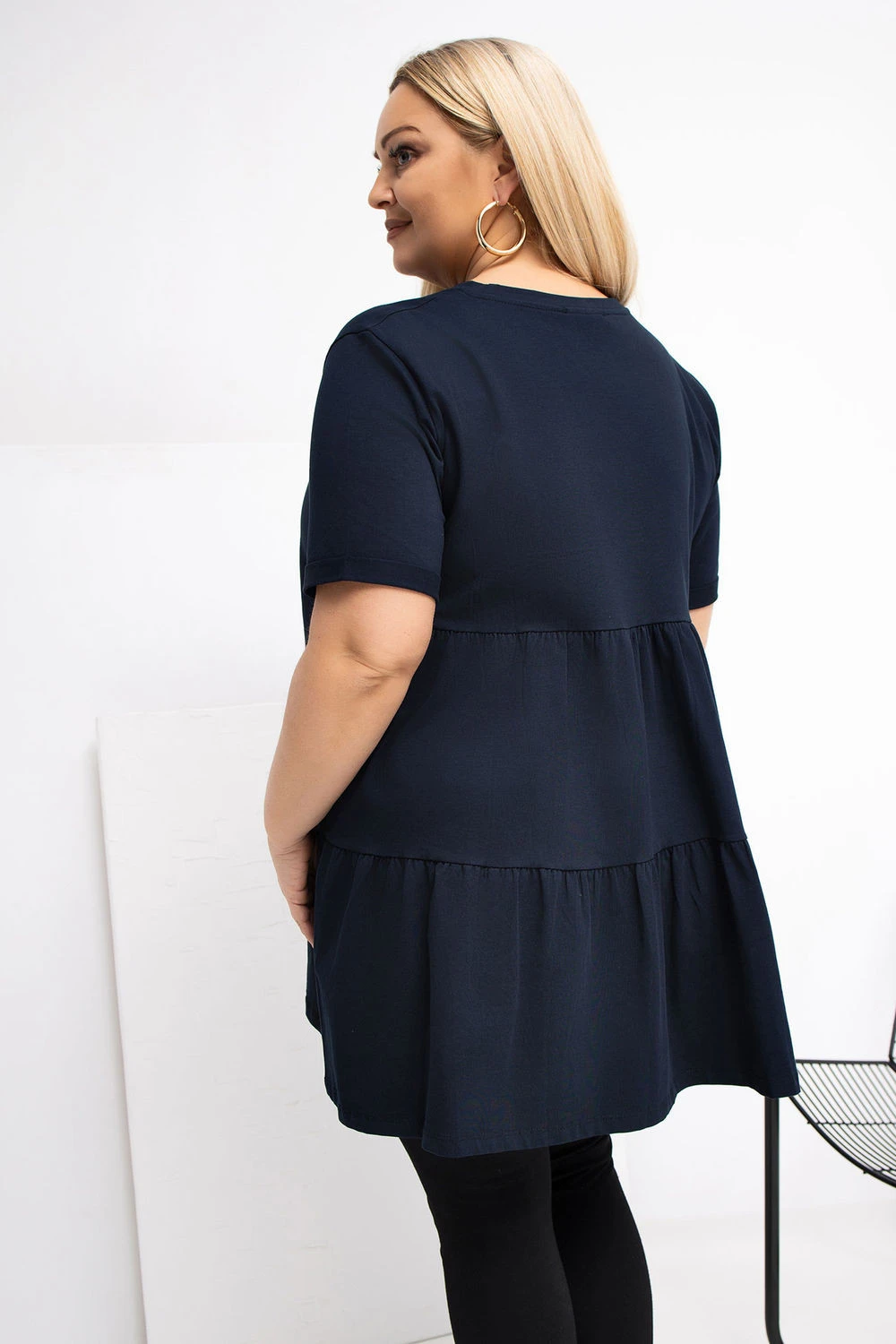 Prodloužený top ve stylu casual, ideální na každodenní příležitosti. Vyrobený z příjemné bavlny s přídavkem elastanu, díky čemuž je měkký, elastický a pohodlný na nošení po celý den. Hladký vzor umožňuje snadno kombinovat s mnoha stylizacemi. Model má kulatý výstřih a krátký rukáv, co mu dodává univerzální, uvolněný charakter. Bez zapínání zdůrazňuje jednoduchý, pohodlný střih. Další výhodou je volánka dole vzadu, která jemně oživuje střih a dodává mu ženský šarm. Ideální volba na každý den k džínám, legínám nebo sukní.