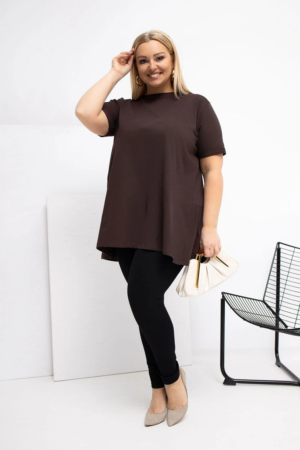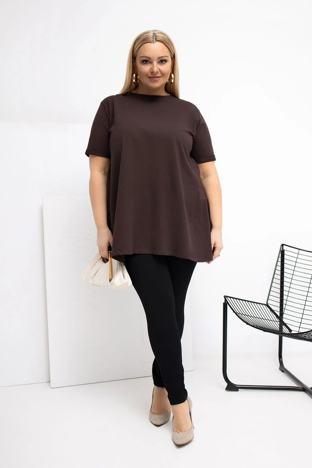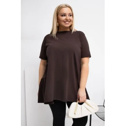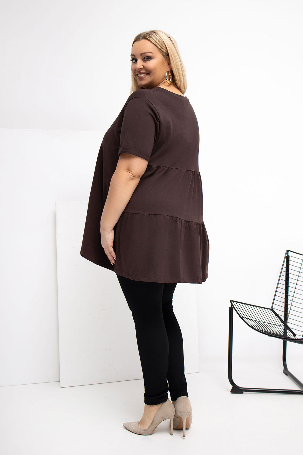 Prodloužený top ve stylu casual, ideální na každodenní příležitosti. Vyrobený z příjemné bavlny s přídavkem elastanu, díky čemuž je měkký, elastický a pohodlný na nošení po celý den. Hladký vzor umožňuje topu snadno ladit s různými styly. Model má kulatý výstřih a krátký rukáv, co mu dodává univerzální a uvolněný charakter. Chybějící zapínání zdůrazňuje jednoduchý a pohodlný střih. Další výhodou je volánka dole vzadu, která jemně ozvláštňuje střih a dodává mu ženský šarm. Ideální návrh na každý den k džínům, legínám nebo sukně.