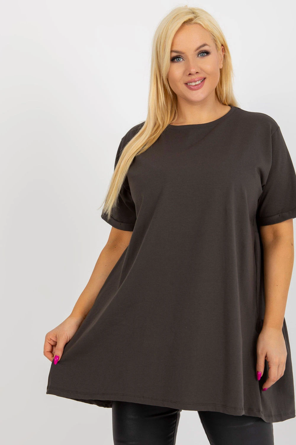 Prodloužený casual tričko, ideální na každodenní příležitosti. Vyrobeno z příjemné bavlny s přídavkem elastanu, díky čemu je měkké, elastické a pohodlné na nošení po celý den. Hladký vzor dělá tričko snadno kombinovatelné s mnoha stylizacemi. Model má kulatý výstřih a krátký rukáv, co mu dodává univerzální, uvolněný charakter. Chybějící zapínání zdůrazňuje jednoduchý, pohodlný střih. Další výhodou je volánka dole vzadu, která jemně oživuje střih a dodává mu ženské kouzlo. Ideální volba na každý den k džínům, legínám nebo sukni.