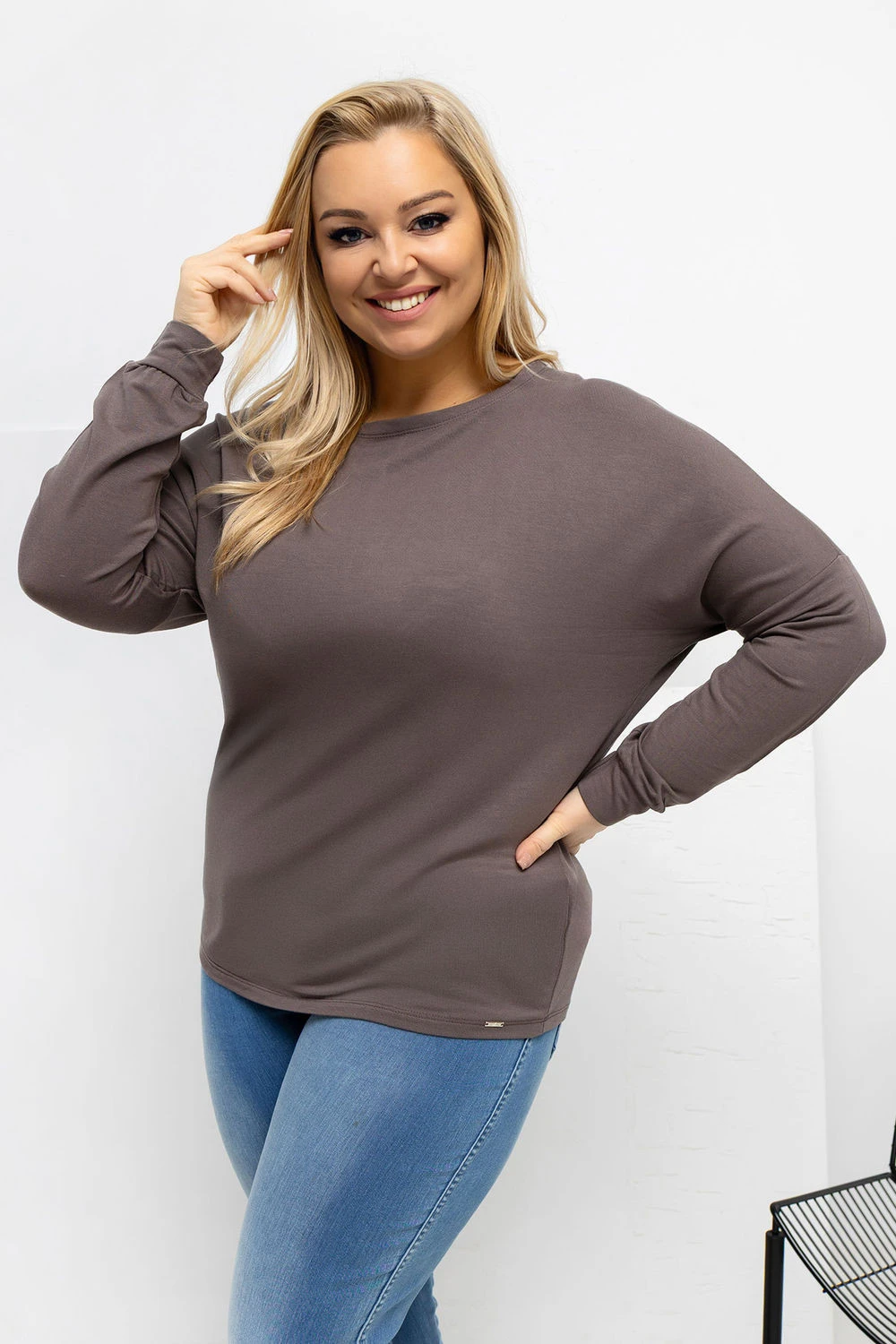 Blůza ve velikosti plus s klasickým, kulatým výstřihem, navržená s ohledem na pohodlí a každodenní nošení. Model v casual stylu, ideální na každodenní příležitosti do práce, pro procházky nebo setkání ve volném kruhu. Hladký vzor činí z blůzy univerzální kousek, snadno kombinovatelný. Vyrobená z vysoce kvalitního mikro modálu s přídavkem elastanu, materiál je mimořádně měkký, lehký a elastický, díky čemuž se skvěle přizpůsobuje postavě, neomezujíc pohyb. Standardní délka a dlouhý rukáv zajišťují pohodlí po celý den. Absence zapínání zdůrazňuje jednoduchý, pohodlný střih. Jedná se o skvělou základnu pro mnoho každodenních outfitů, ať už s džínami nebo sukní.
