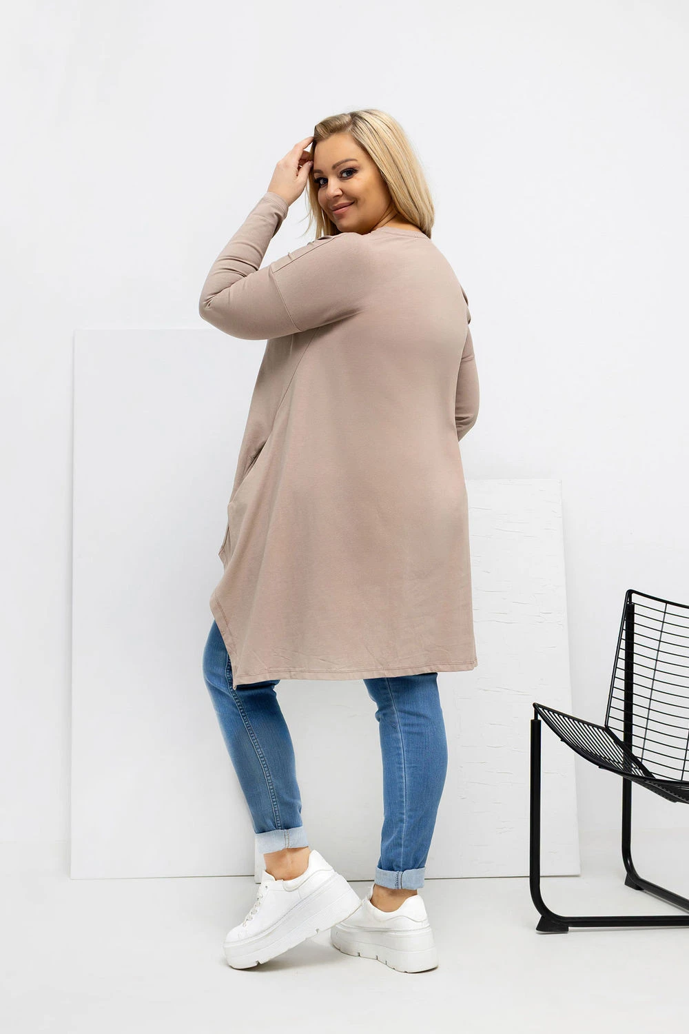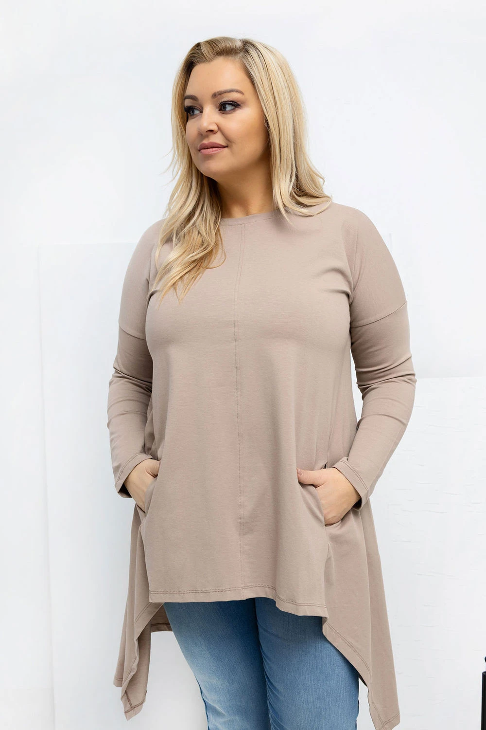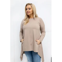 Asymetrická košile plus size v casual stylu je ideální nabídkou na každý den, spojující pohodlí s módním vzhledem. Model s kratším předním a delším zadním dílem jemně zúží postavu a zajistí volnost pohybu. Hladký střih činí košili univerzální a snadno kombinovatelnou, skvěle se hodí jak k džínům, tak k legínám. Vyrobena z vysoce kvalitní bavlny s přídavkem elastanu, je měkká, prodyšná a elastická, díky čemuž skvěle padne k postavě. Dlouhý rukáv a klasický, kulatý výstřih zdůrazňují její každodenní charakter. Praktickou výhodou jsou kapsy skryté v bocích, které přidávají funkcionalitu a moderní akcent. Košile nemá zapínání, což zvyšuje pohodlí nošení a zdůrazňuje její volný, uvolněný styl.