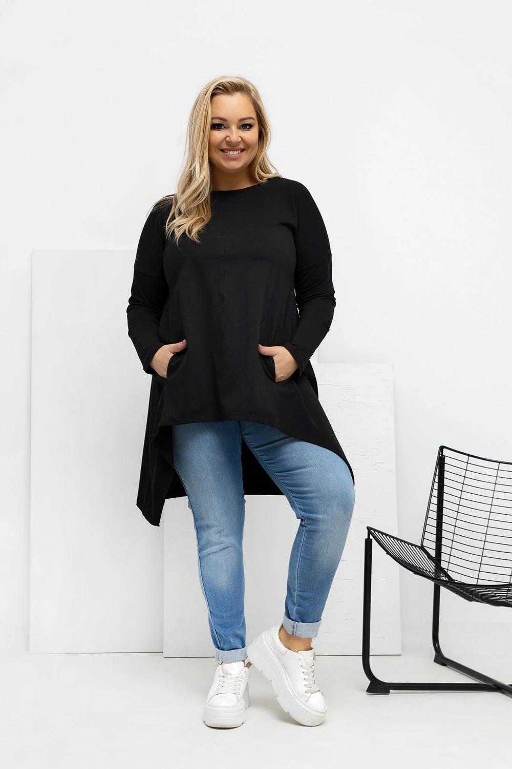 Asymetrická blůza plus size v casual stylu je ideální nabídkou na každý den, kombinující pohodlí s moderním vzhledem. Model s kratším předním a delším zadním dílem jemně zjemňuje postavu a zajišťuje volnost pohybu. Hladký střih činí z blůzy univerzální kousek snadno kombinovatelný, skvěle se hodí jak k džínům, tak k legínám. Vyrobená z vysoce kvalitní bavlny s přídavkem elastanu je měkká, prodyšná a elastická, díky čemuž skvěle padne k postavě. Dlouhý rukáv a klasický, kulatý výstřih zdůrazňují její každodenní charakter. Praktickou výhodou jsou kapsy skryté v bočních švech, které přidávají funkčnost a moderní nádech. Blůza nemá zapínání, což zvyšuje pohodlí nošení a zdůrazňuje její volný, uvolněný styl.