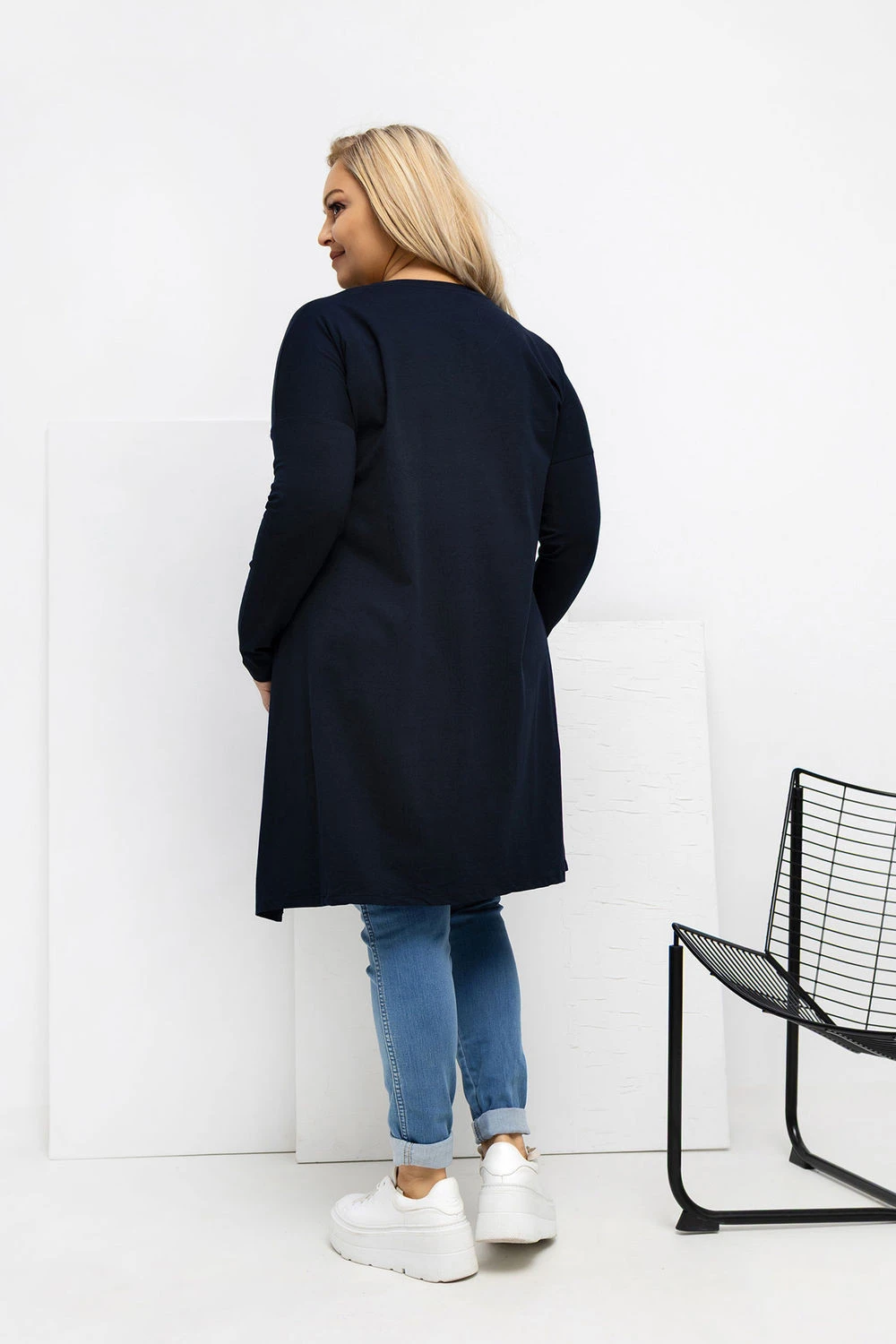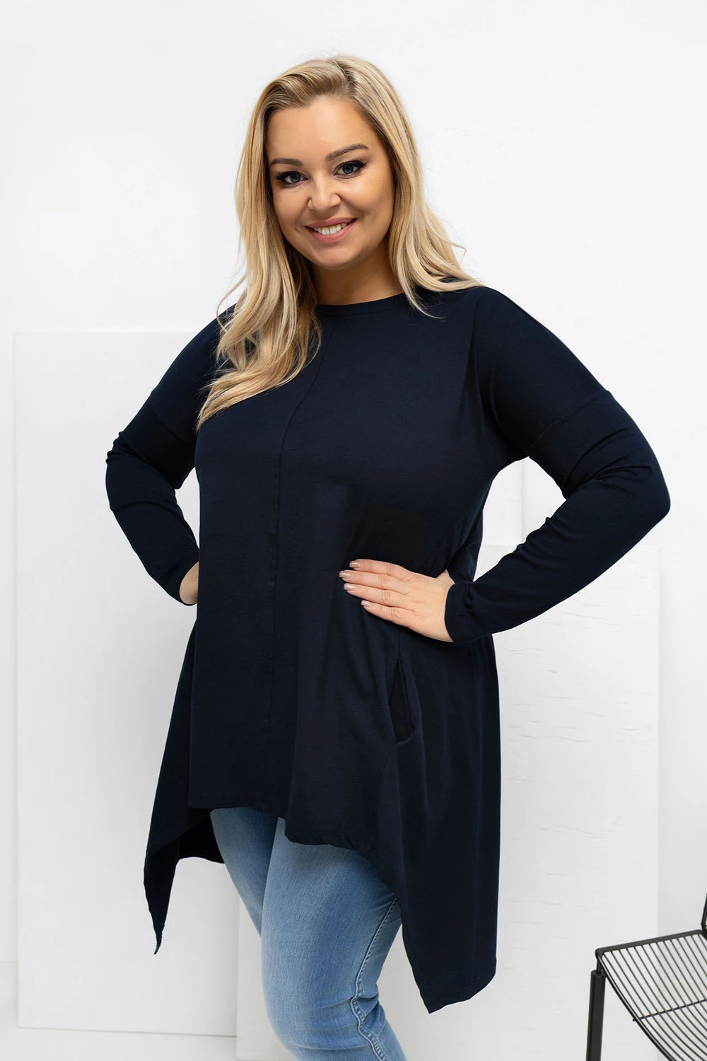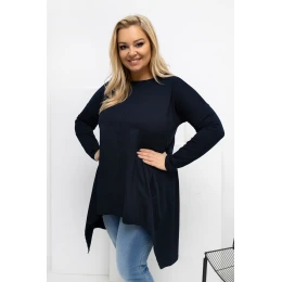 Asymetrická blůza plus size ve stylu casual je ideální nabídkou na každý den, kombinuje pohodlí s moderním vzhledem. Model s kratším předním dílem a delším zadním dílem opticky zeštíhlí postavu a zajišťuje volnost pohybu. Hladký střih činí z blůzy univerzální kousek, který je snadný na styling a skvěle se hodí jak k džínám, tak k legínám. Vyrobená z vysoce kvalitní bavlny s přídavkem elastanu, je měkká, prodyšná a elastická, díky čemuž se skvěle přizpůsobuje postavě. Dlouhý rukáv a klasický, kulatý výstřih zdůrazňují její každodenní charakter. Praktickým bonusem jsou kapsy skryté v bočních švech, které přidávají funkčnost a moderní akcent. Blůza nemá zapínání, což zvyšuje pohodlí nošení a zdůrazňuje její uvolněný, volný styl.