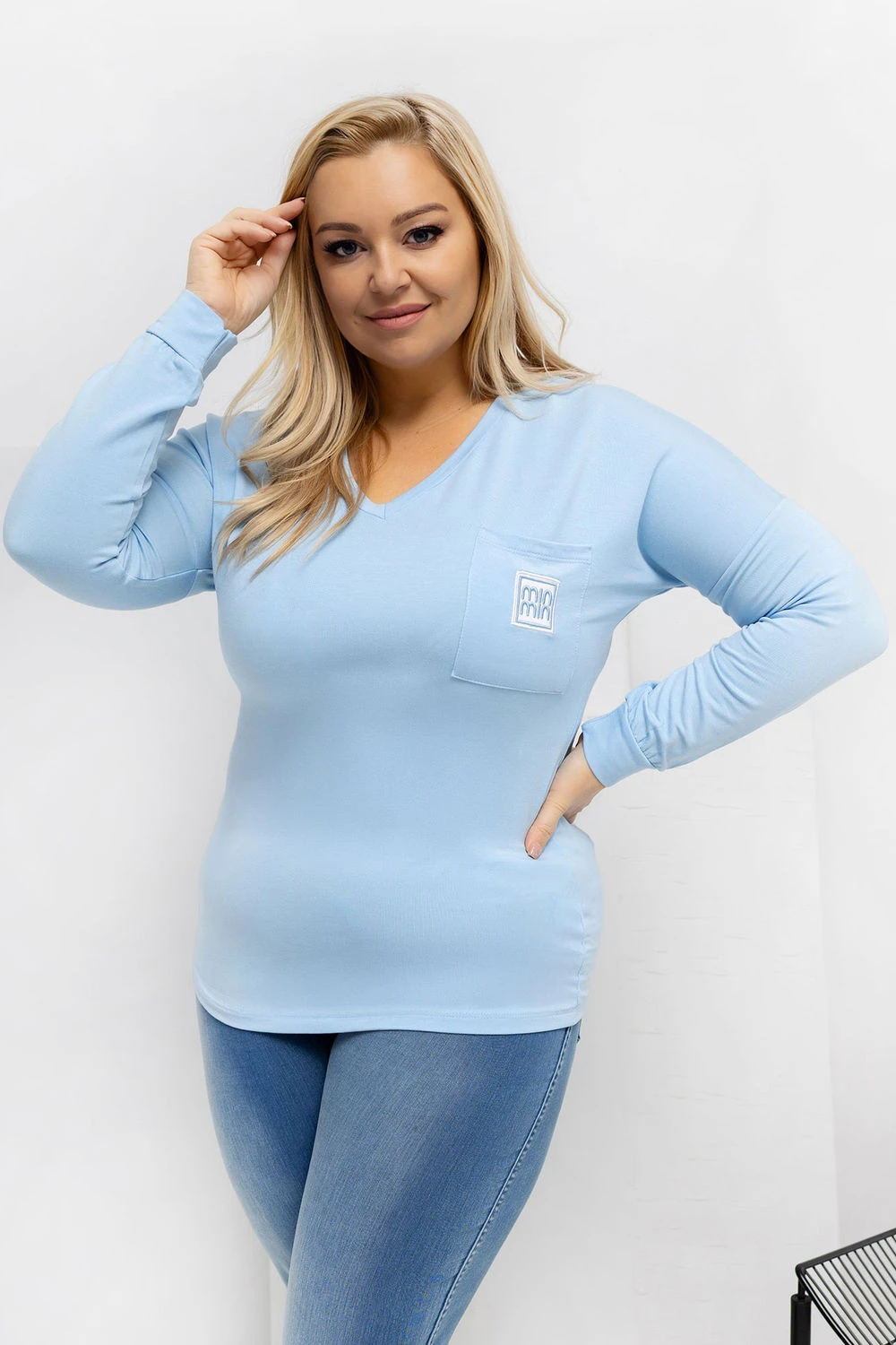 Košile plus size s klasickým, každodenním charakterem je skvělou základnou pro mnoho stylizací. Hladký vzor jí dodává univerzálnost, díky čemuž ji lze snadno sladit jak s džíny, tak s látkovými kalhotami nebo legíny. Standardní délka zajišťuje, že košile dobře padne na postavu a poskytuje pohodlí po celý den. Model je vyroben z mimořádně měkkého mikromodalu s přídavkem elastanu, který je příjemný na dotek, prodyšný a elastický. Dlouhý rukáv a výstřih ve tvaru srdce decentně zdůrazňují krk a dekolt, přidávají lehkost celku. Košile nemá zapínání, což zvyšuje pohodlí při nošení. Stylovým akcentem je kapsa na úrovni hrudníku zdobená dekorační nášivkou, která láme jednoduchý tvar a dodává košili moderní charakter.