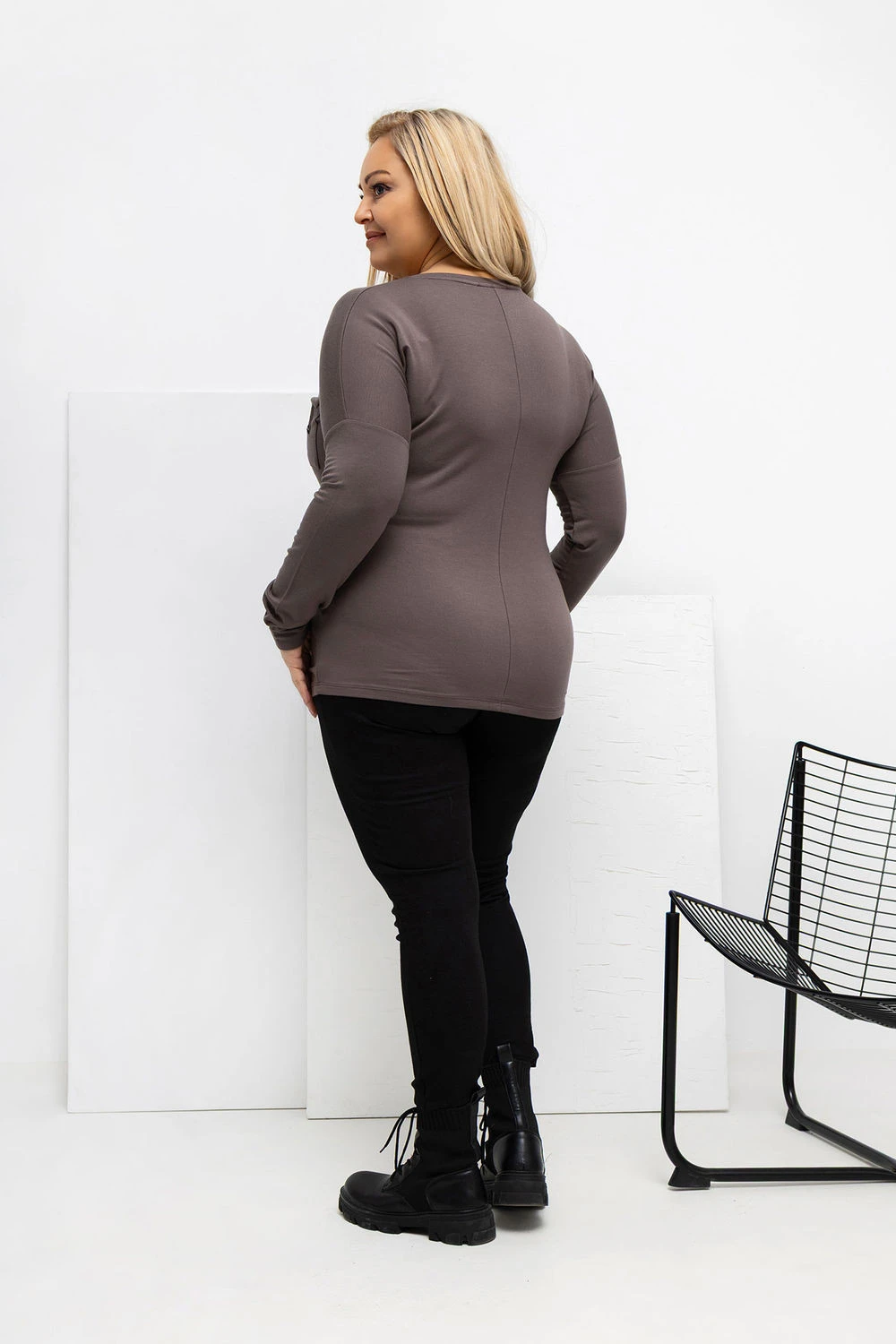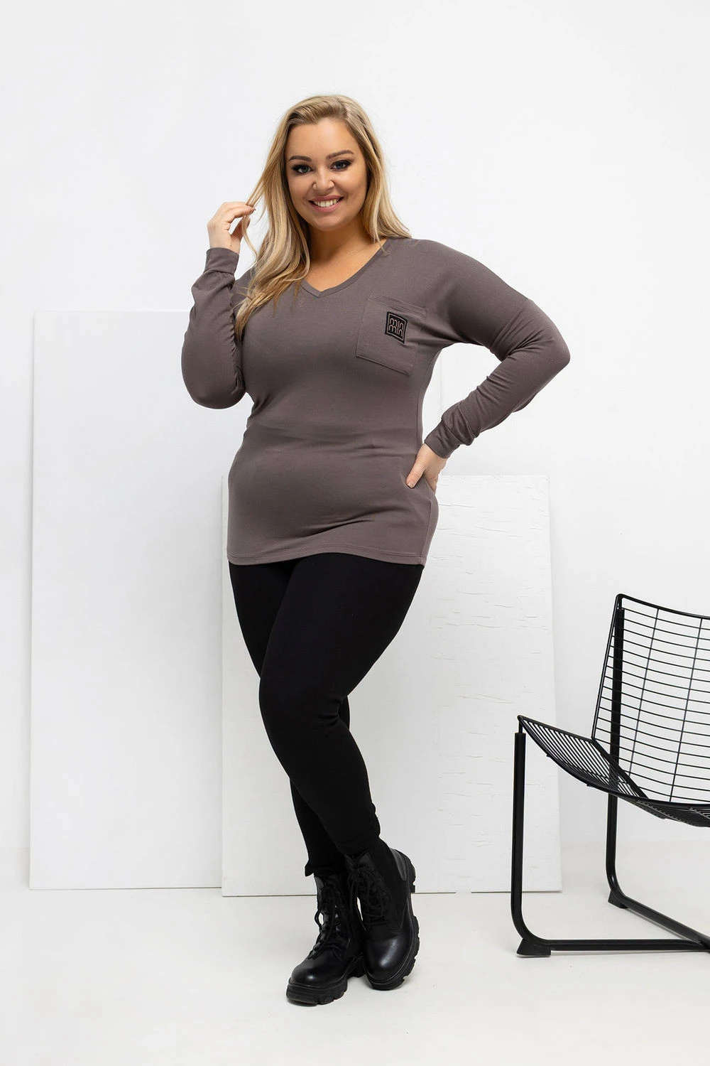Blůza ve velikosti plus s klasickým, každodenním charakterem je skvělou základnou pro mnoho stylizací. Hladký vzor jí dodává univerzálnost, díky čemuž ji lze snadno sladit jak s džíny, tak i s látkovými kalhotami nebo legíny. Standardní délka zajišťuje, že blůza dobře padne na postavě a poskytuje pohodlí po celý den. Model je vyroben z velmi měkkého micro modalu s přídavkem elastanu, který je příjemný na dotek, prodyšný a elastický. Dlouhý rukáv a výstřih do V decentně zdůrazňují krk a dekolt, dodávají celku lehkost. Blůza nemá zapínání, což zvyšuje pohodlí při nošení. Stylovým detailem je kapsa na hrudi zdobená dekorativní nášivkou, která prolomuje jednoduchý tvar a dodává blůze moderní charakter.
