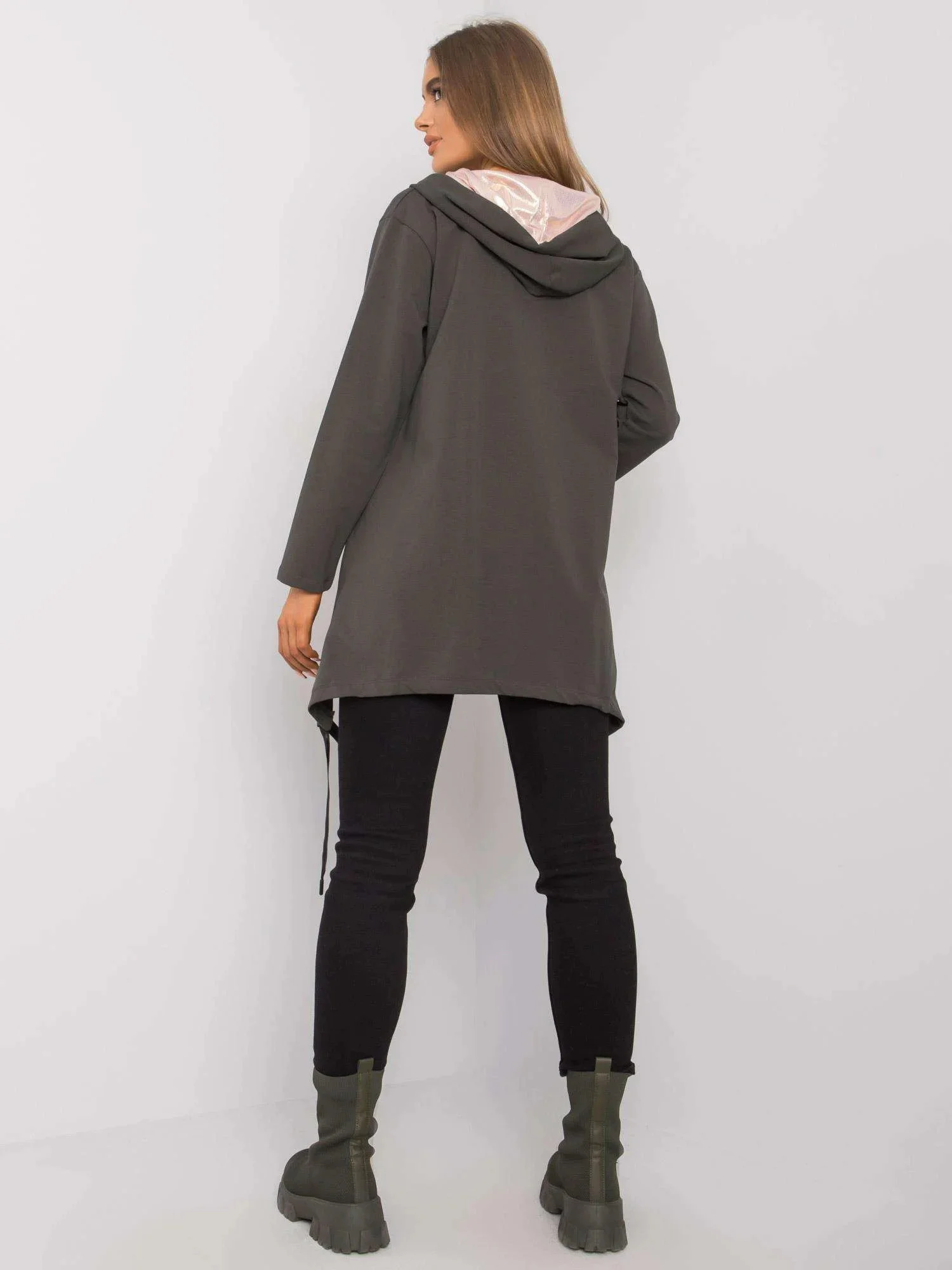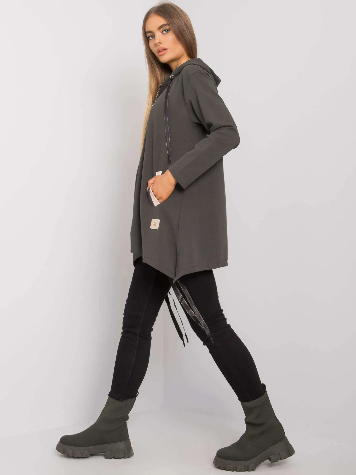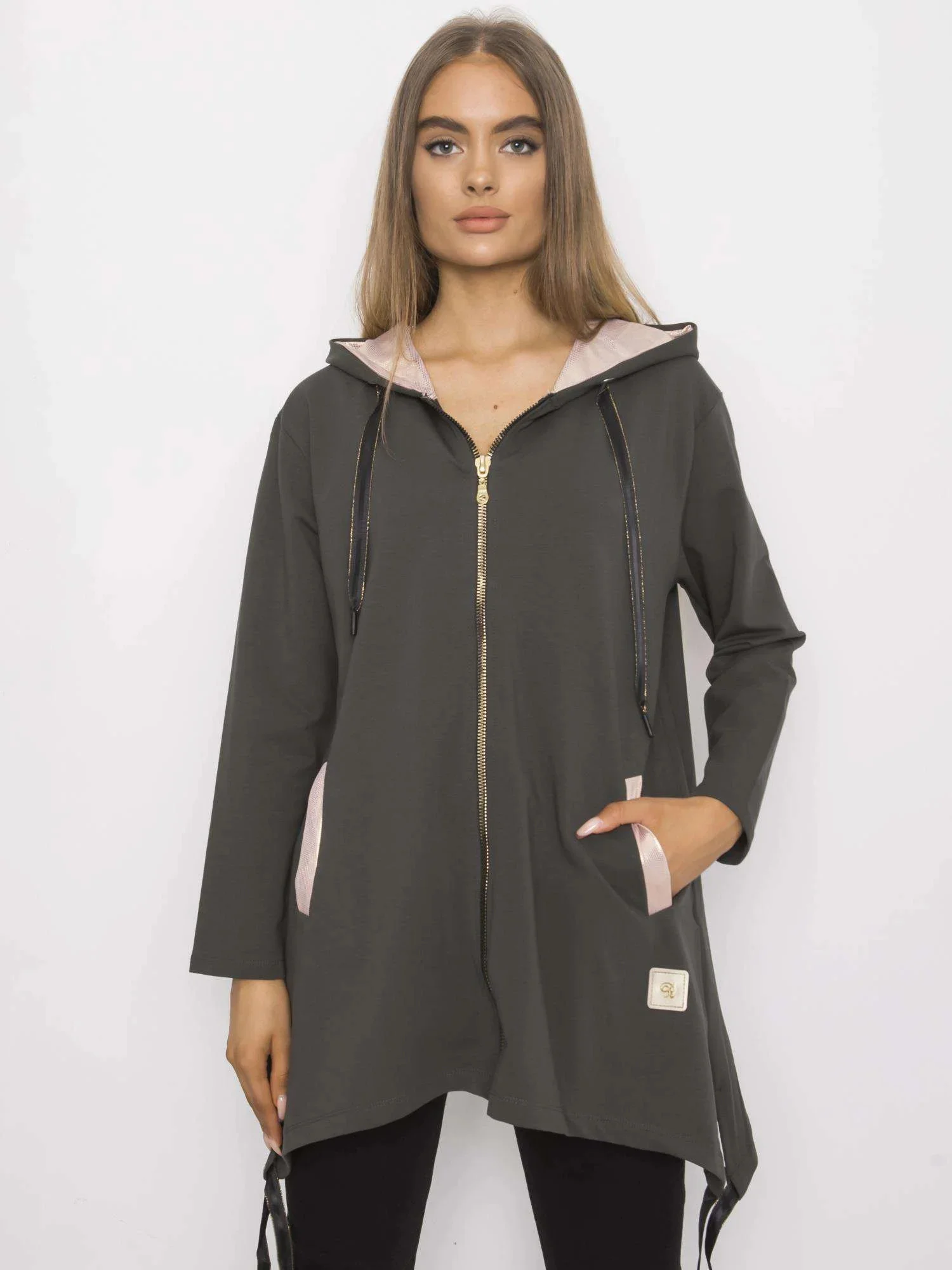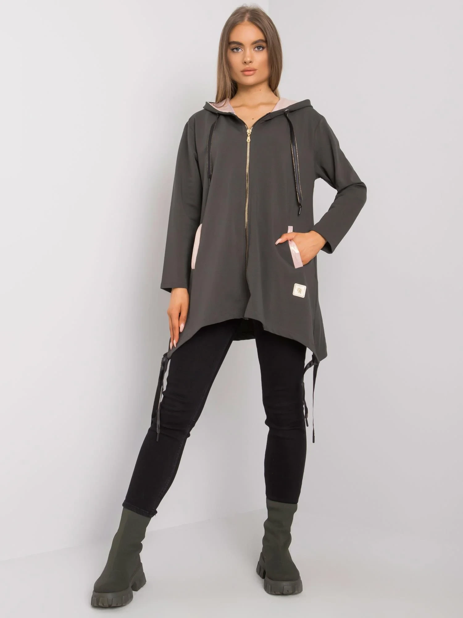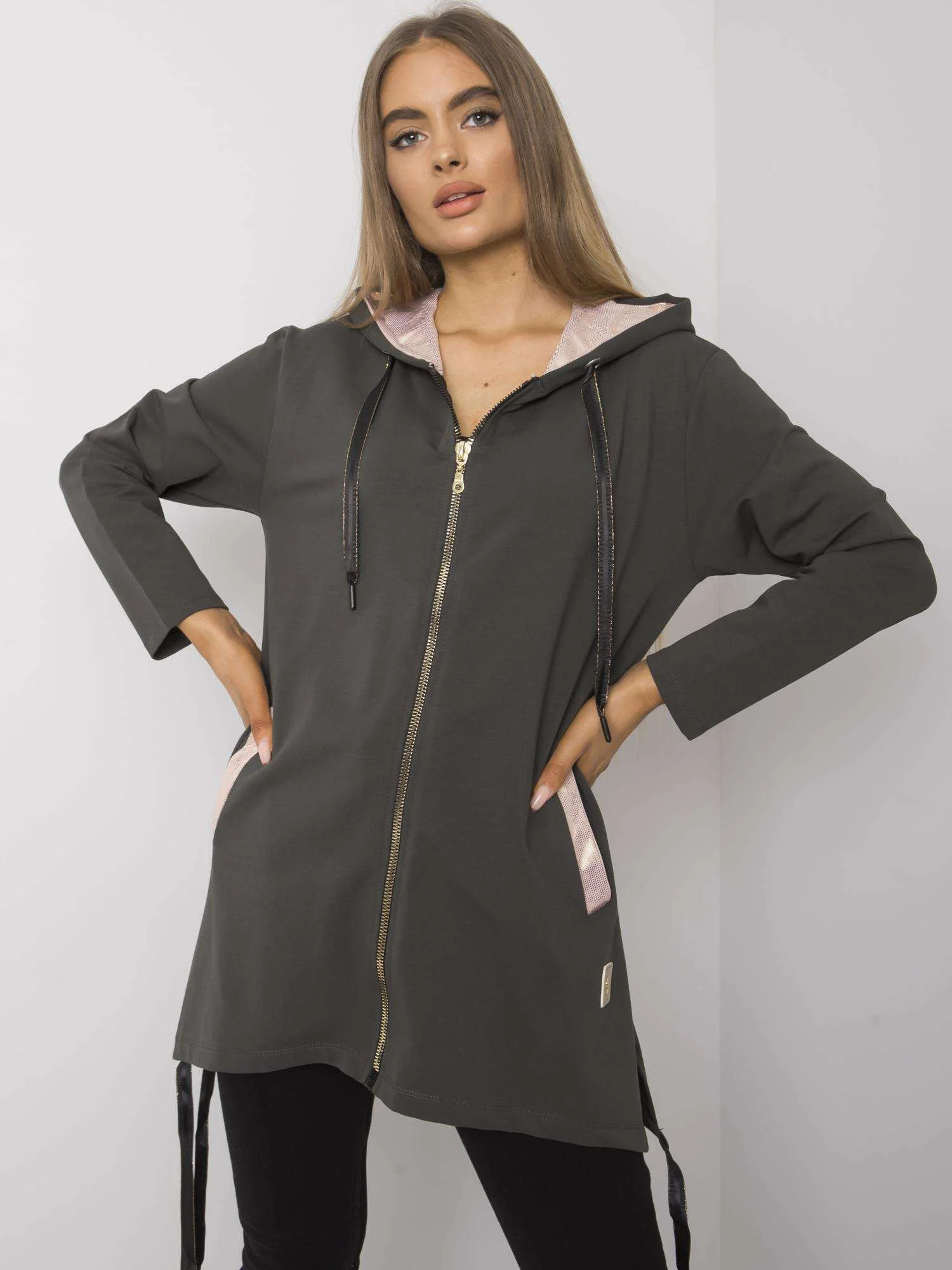 Tmavá khaki mikina na zip s kapsami.