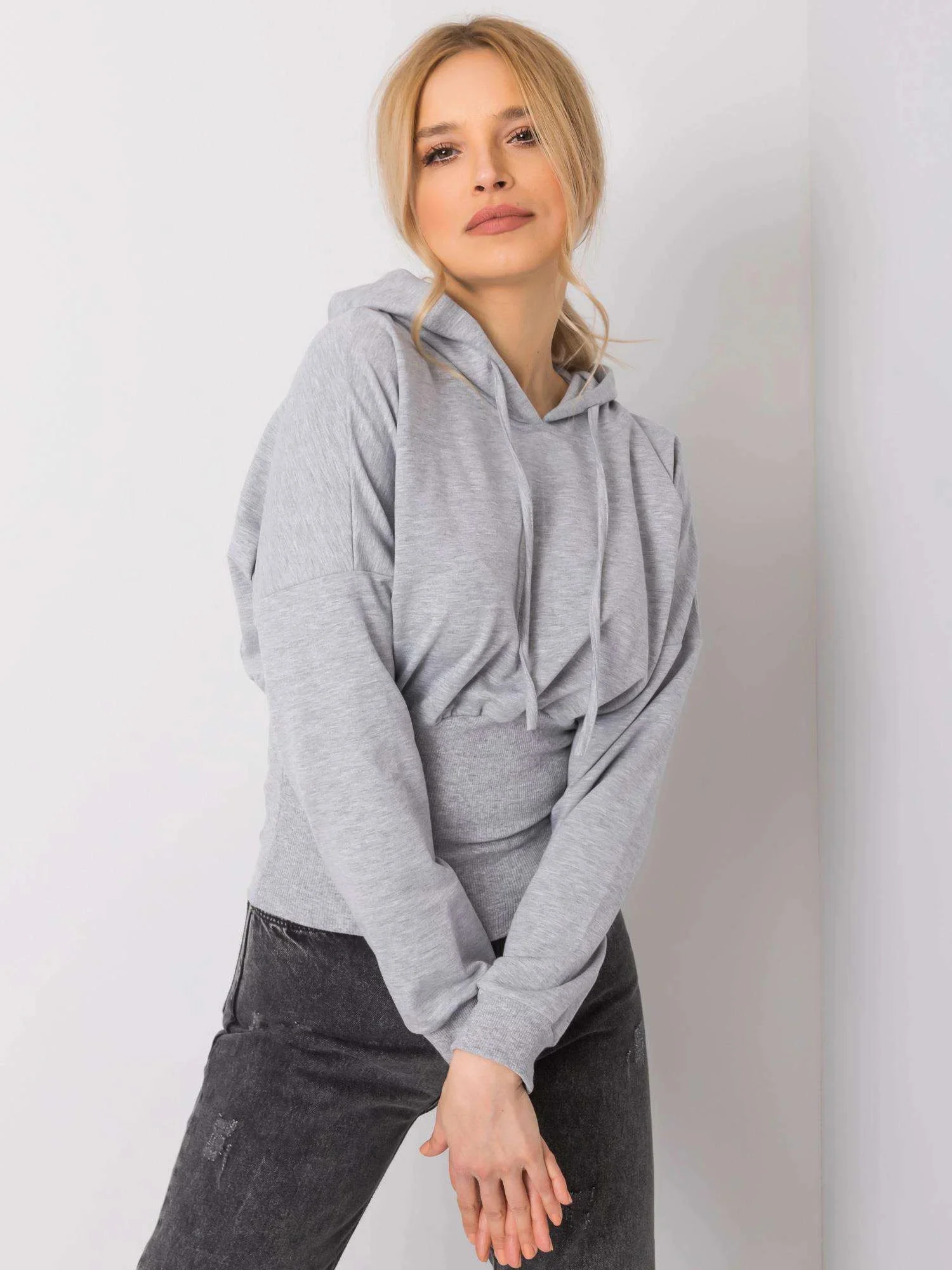 RUE PARIS Šedá melanžová mikina s kapucí a stahovací šňůrkou.