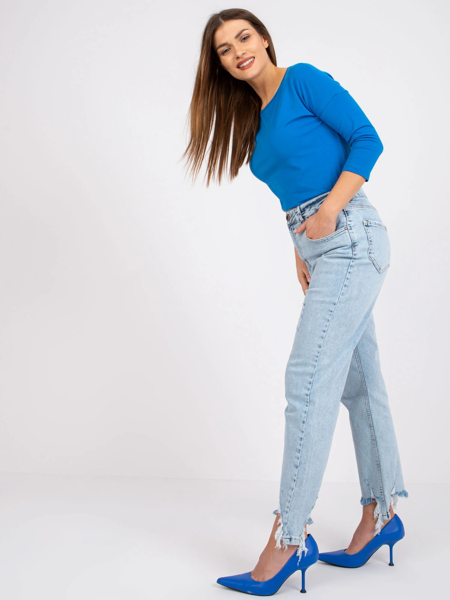 Dubnová modrá halenka. Jednobarevná dámská základní halenka je důležitou součástí šatníku každé ženy. Je to velmi univerzální kousek, který se hodí k mnoha různým stylům a lze z něj vytvořit krásné komplety do práce, do školy i na neformální setkání. Tato základní dámská halenka má ženský výstřih, trendy 3/4 rukávy a volnější střih, který měkce sedí na postavě a vypadá krásně. Model je vyroben z nejkvalitnějších materiálů, které společně vytvářejí příjemnou a vzdušnou směs. Dámskou základní halenku lze snadno stylizovat sportovně i mnohem více žensky, takže si s ní každá žena vytvoří komplet, který potřebuje. Tuto halenku můžete nosit k džínovým nebo látkovým kalhotám, stejně jako k elegantním sukním a botám na podpatku z naší nejnovější online kolekce.