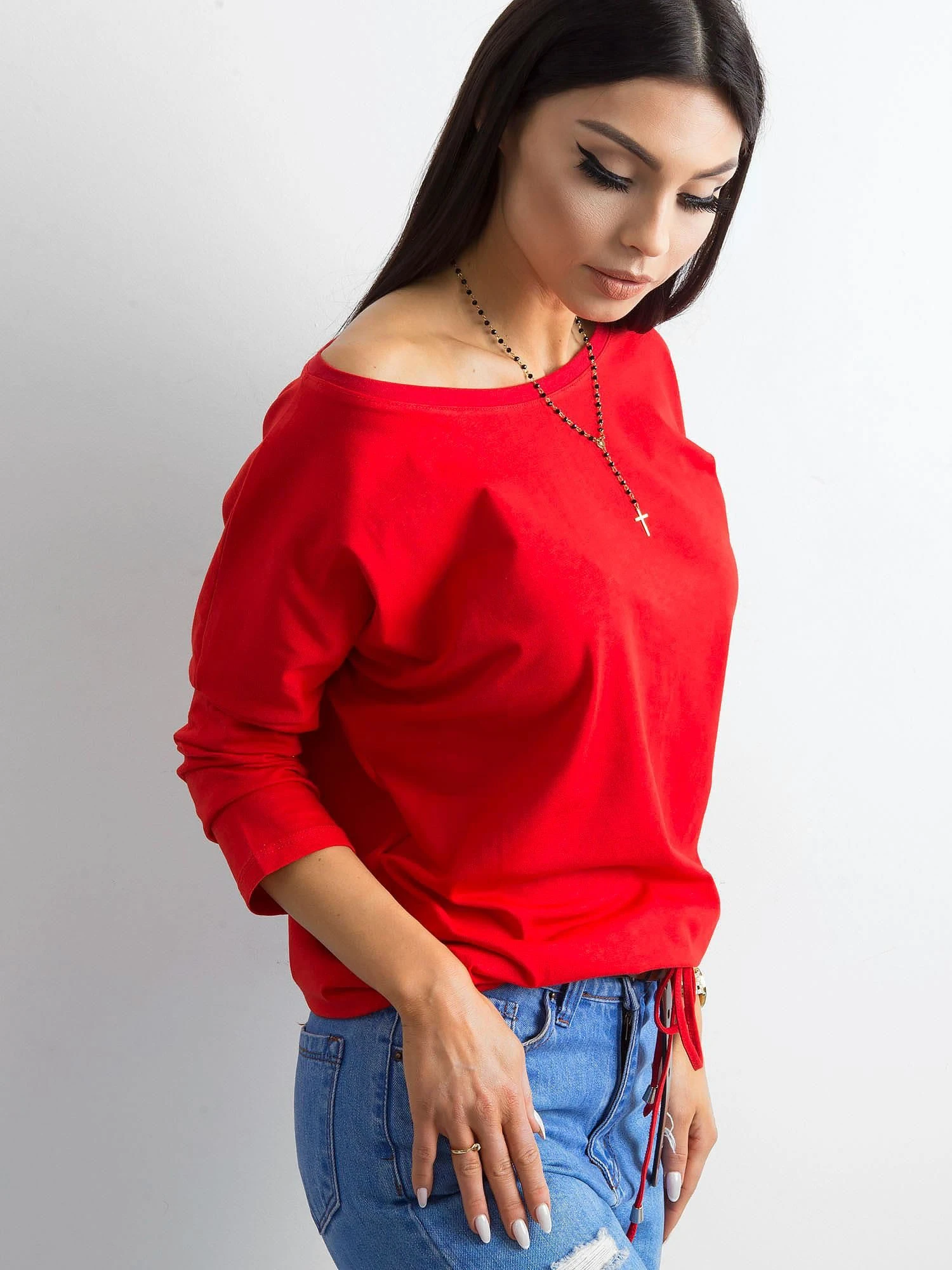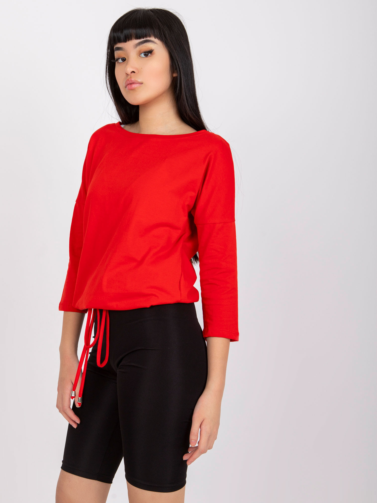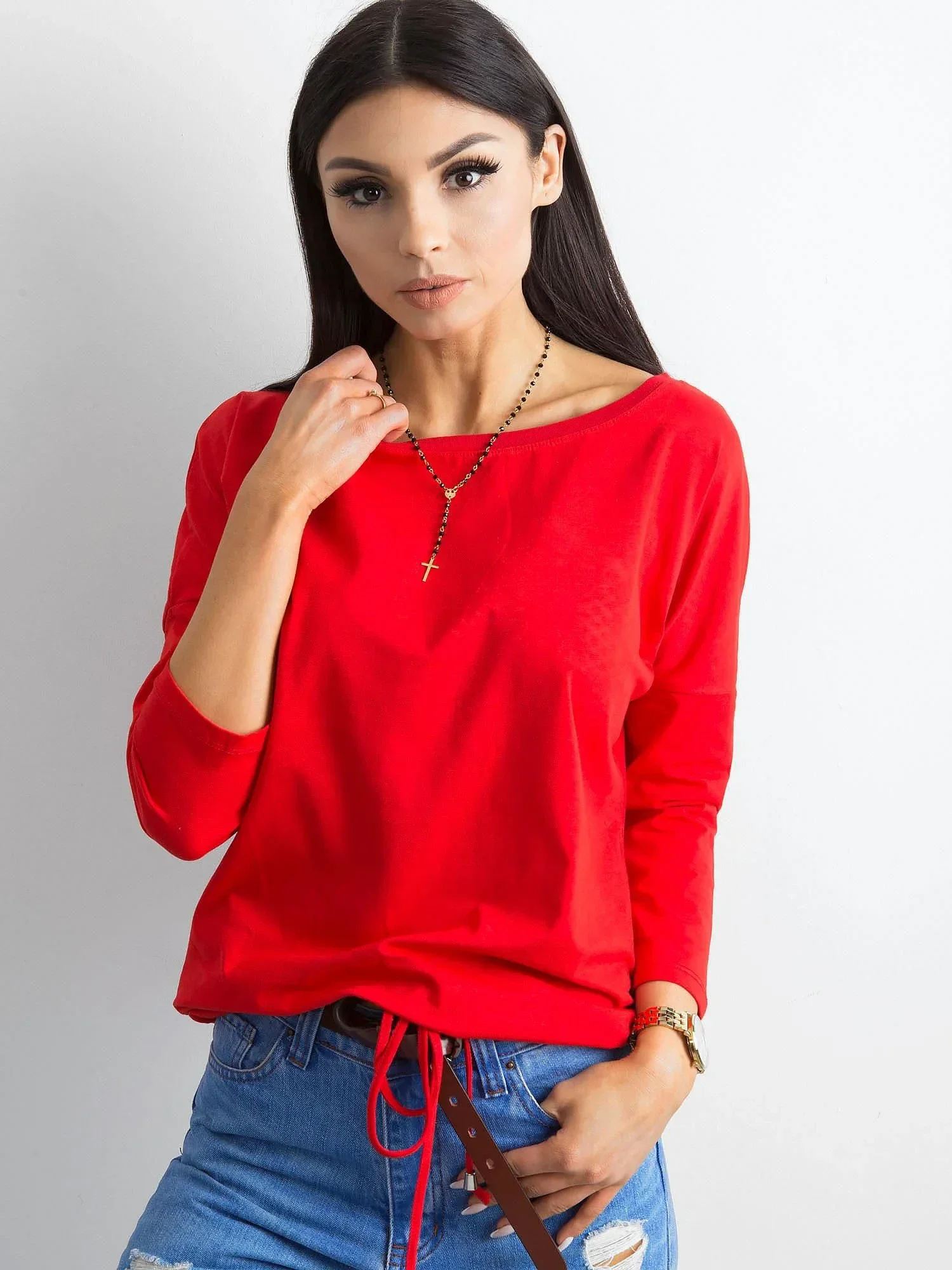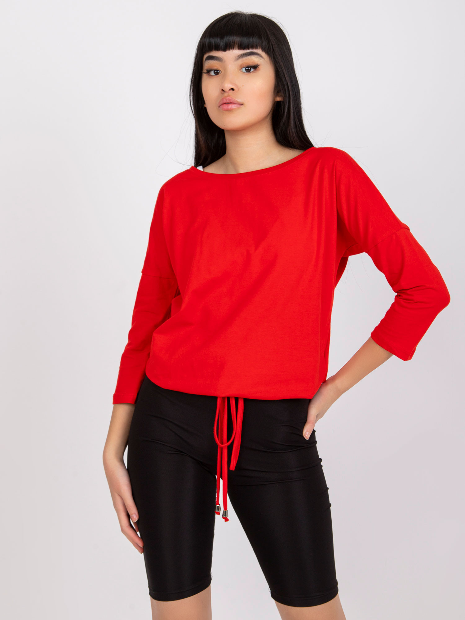 Czerwona bluzka Fiona. Gładka bluzka z bawełny jest wspaniałym uzupełnieniem każdej damskiej garderoby. Pozwala bowiem łatwo i szybko ubrać się na każdą sytuację, w której nie musimy prezentować się elegancko czy formalnie. Mimo to ta bluzka basic ma w sobie mnóstwo wdzięku i kobiecego uroku, a to za sprawą szerokiego dekoltu w kształcie łódki. Model ten wykonano z delikatnej i niezbyt grubej bawełny z niewielkim dodatkiem nowoczesnego elastanu. Takie połączenie sprawia, że bluzka jest jednocześnie miękka i przyjemna w dotyku, a także przewiewna, przyjazna dla skóry i ładnie układa się na sylwetce. Dodatkowymi atutami tego modelu są również modne rękawy długości 3/4 oraz ozdobny troczek ze ściągaczem u dołu, które subtelnie podkręcają jej design. Prosty, lekko luźniejszy krój pozwala czuć się swobodnie, a bogactwo kolorów dostępnych w naszym sklepie internetowym z pewnością spodoba się wielu miłośniczkom najnowszych trendów. Ponadto zwróć jeszcze uwagę