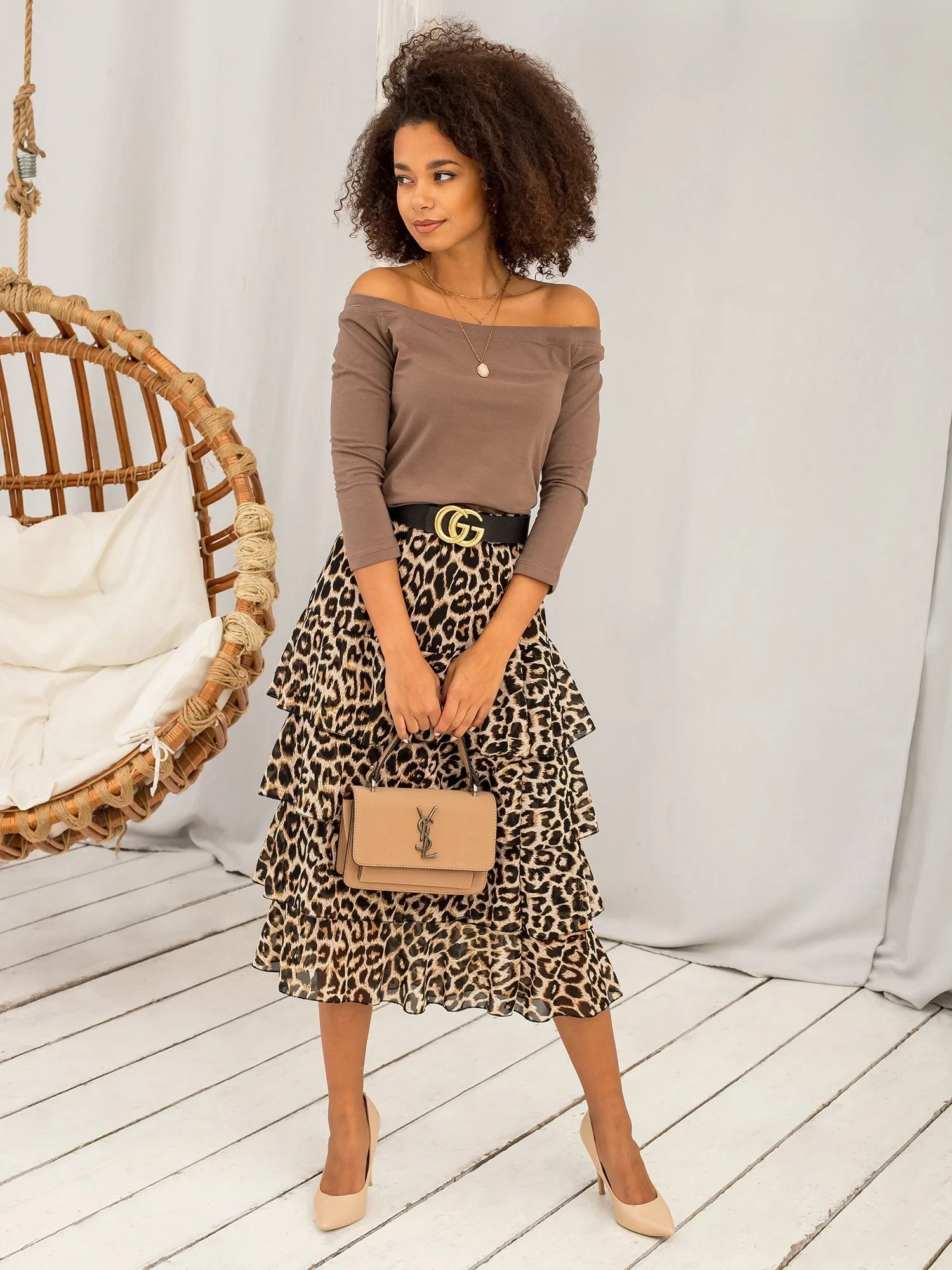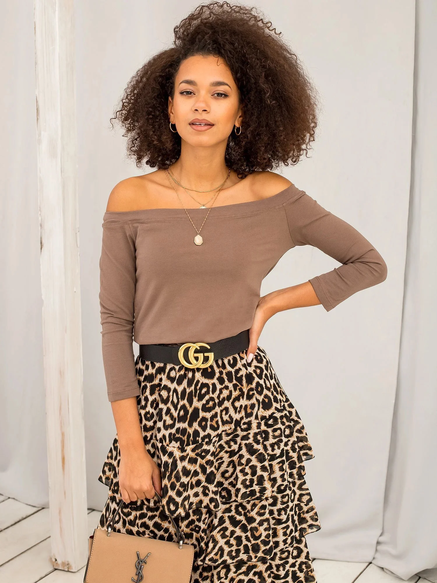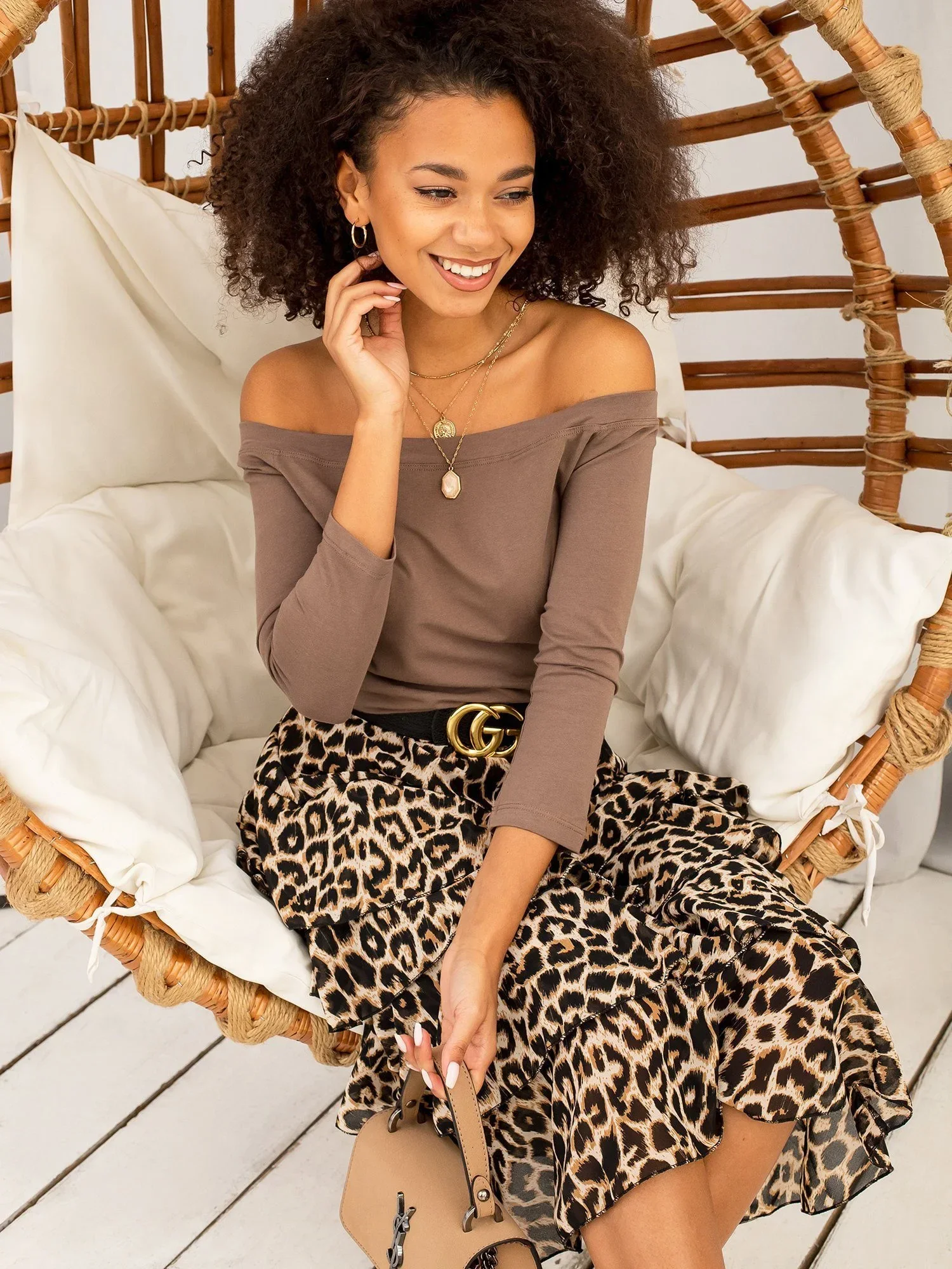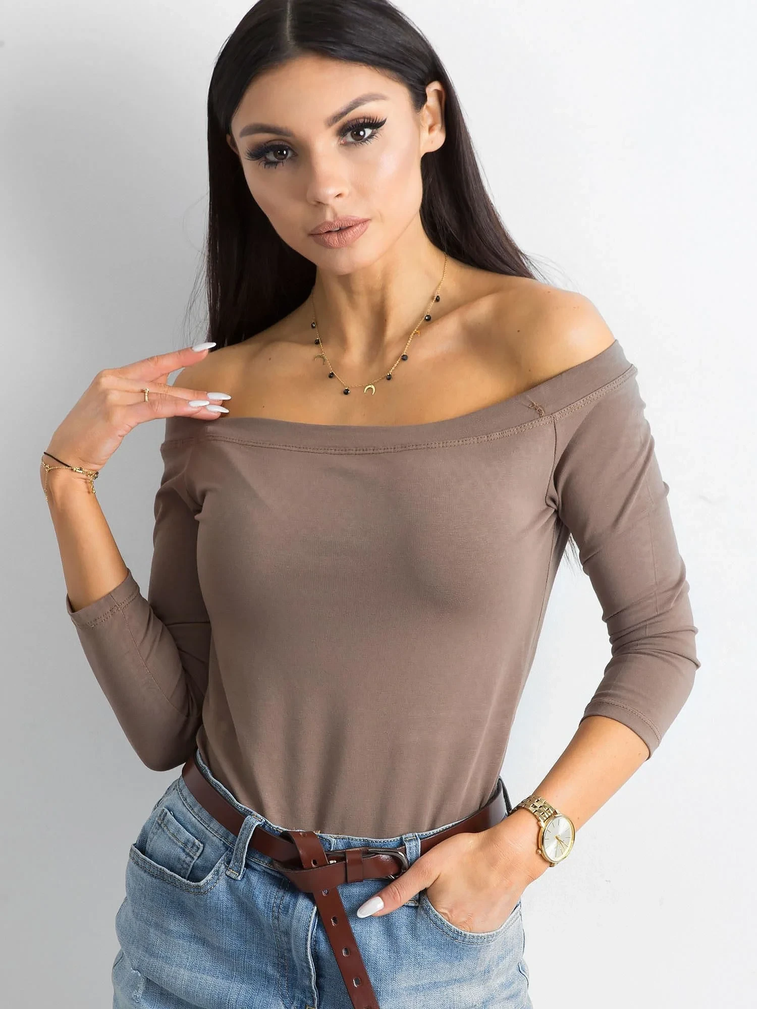 Ta wyjątkowa bluzka hiszpanka basic została stworzona z myślą o pewnych siebie kobietach, które w każdych okolicznościach chcą wyróżniać się modnymi stylizacjami. Jeśli na bieżąco śledzisz najnowsze trendy i chcesz dać temu wyraz w swoich stylizacjach, postaw na prezentowany model w ciekawym odcieniu. Wyjątkowa bazowa hiszpanka została starannie wykonana z przyjemnej w dotyku bawełny, co z pewnością spodoba się wszystkim fankom naturalnych tkanin. Posiada praktyczny rękaw o długości 3/4. Brązowa bluzka basic będzie się znakomicie prezentowała w towarzystwie spódnicy w kolorowe wzory, np. inspirowane światem dzikich zwierząt. Możesz również dobrać do niej beżową czy złotą solejkę. Całość świetnie uzupełnią dodatki w postaci modnego paska oraz kopertówki. Masz ochotę na modny wielkomiejski look? Brązową bluzkę z hiszpańskim dekoltem noś w towarzystwie szykownych cygaretek oraz szpilek. Do całości looku dobierz przykuwającą uwagę biżuterię.