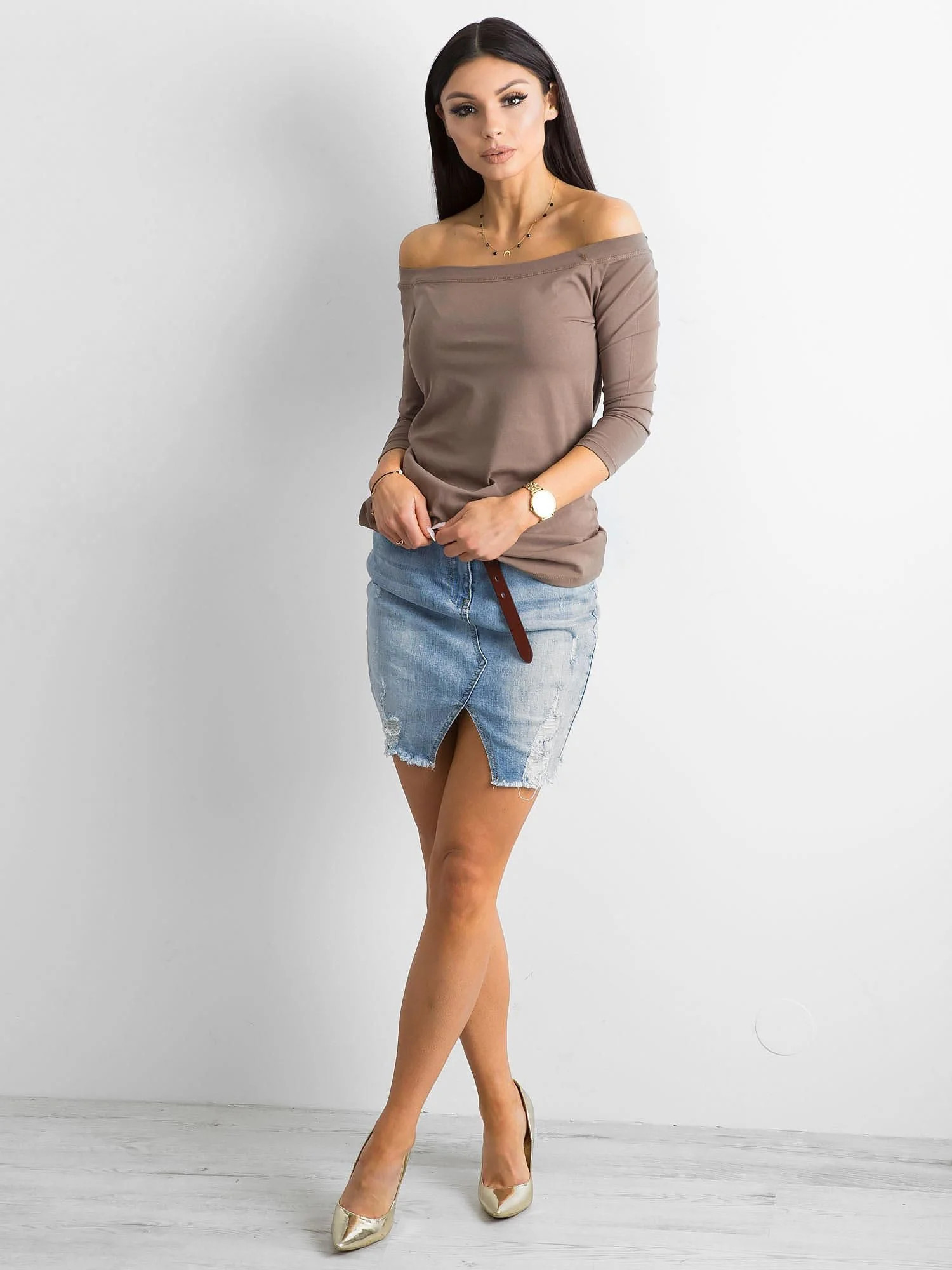 Brązowa bluzka Live. Bluzki damskie w stylu basic podbijają świat mody! Kobiety uwielbiają ten nurt, ponieważ jest uniwersalny i pasuje do wielu różnych stylizacji. Ta bluzka basic została zainspirowana ubraniami w stylu hiszpańskim, co zdradza jej piękny szeroki dekolt zmysłowo odsłaniający ramiona. Taki zabieg sprytnie eksponuje szyję, dzięki czemu każda stylizacja z ta bluzką nabierze kobiecego sznytu. Bluzka jest starannie uszyta z najwyższej jakości materiałów, w których znajdziesz czystą bawełnę oraz elastyczną domieszkę. Sprawia to, że bluzka jest niezwykle miła i miękka w dotyku, a na dodatek idealnie dopasowuje się do figury, co podkreśla atuty sylwetki. Noś ją do kobiecych spódnic z naszej kolekcji online albo do sportowych spodni i legginsów w miejskim stylu.