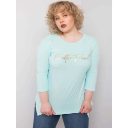 Světle modrá halenka s nápisem.