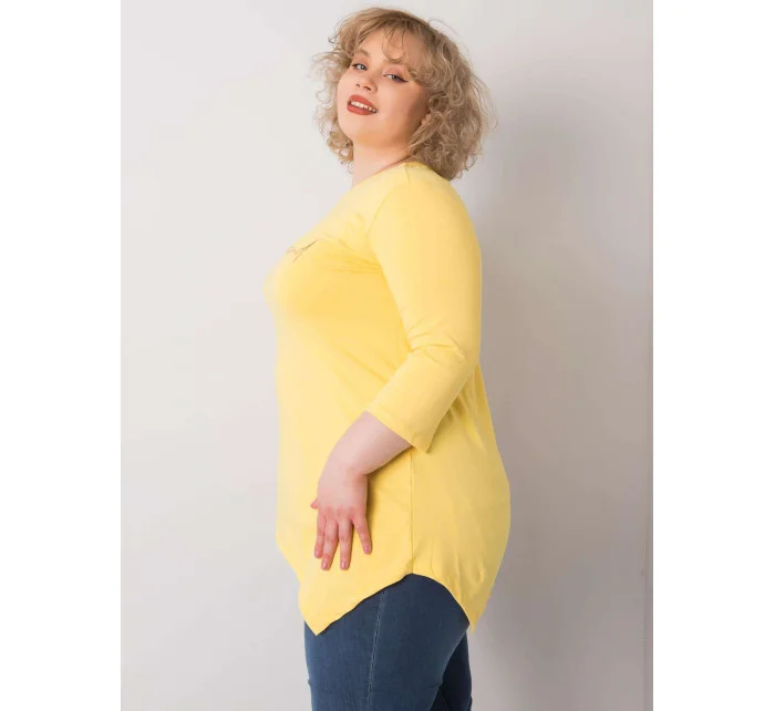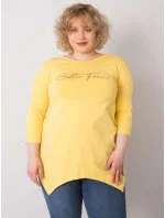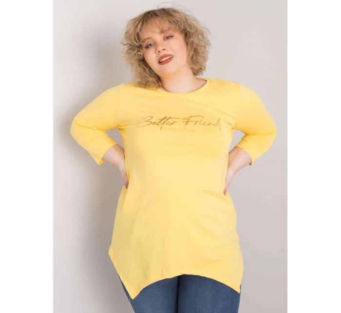 Žlutá halenka s nápisem.