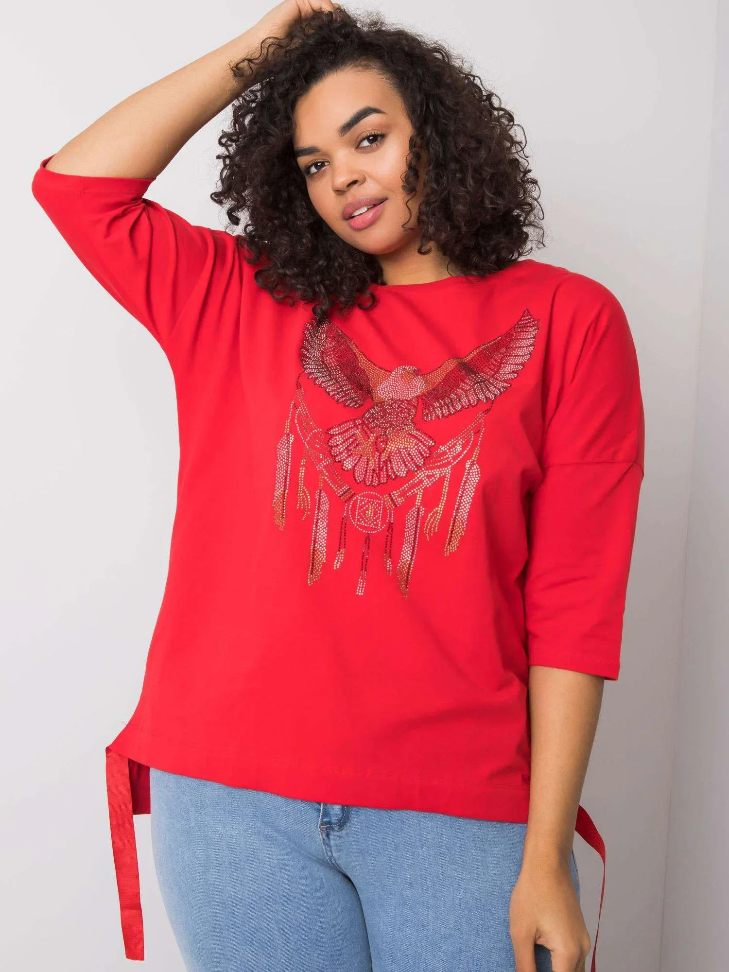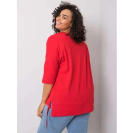 Červená bavlněná halenka s aplikacemi.